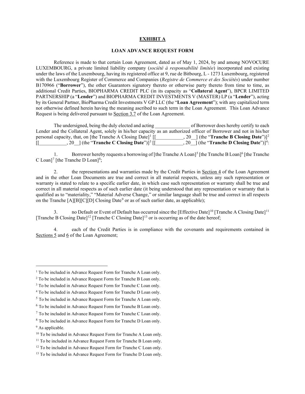 EXHIBIT A LOAN ADVANCE REQUEST FORM Reference is made to that certain Loan Agreement, dated as of May 1, 2024, by and among NOVOCURE LUXEMBOURG, a private limited liability company (société à responsabilité limitée) incorporated and existing under the laws of the Luxembourg, having its registered office at 9, rue de Bitbourg, L - 1273 Luxembourg, registered with the Luxembourg Register of Commerce and Companies (Registre de Commerce et des Sociétés) under number B170966 (“Borrower”), the other Guarantors signatory thereto or otherwise party thereto from time to time, as additional Credit Parties, BIOPHARMA CREDIT PLC (in its capacity as “Collateral Agent”), BPCR LIMITED PARTNERSHIP (a “Lender”) and BIOPHARMA CREDIT INVESTMENTS V (MASTER) LP (a “Lender”), acting by its General Partner, BioPharma Credit Investments V GP LLC (the “Loan Agreement”); with any capitalized term not otherwise defined herein having the meaning ascribed to such term in the Loan Agreement. This Loan Advance Request is being delivered pursuant to Section 3.7 of the Loan Agreement. The undersigned, being the duly elected and acting ______________ of Borrower does hereby certify to each Lender and the Collateral Agent, solely in his/her capacity as an authorized officer of Borrower and not in his/her personal capacity, that, on [the Tranche A Closing Date]1 [[___________, 20__] (the “Tranche B Closing Date”)]2 [[___________, 20__] (the “Tranche C Closing Date”)]3 [[___________, 20__] (the “Tranche D Closing Date”)]4: 1. Borrower hereby requests a borrowing of [the Tranche A Loan]5 [the Tranche B Loan]6 [the Tranche C Loan]7 [the Tranche D Loan]8; 2. the representations and warranties made by the Credit Parties in Section 4 of the Loan Agreement and in the other Loan Documents are true and correct in all material respects, unless any such representation or warranty is stated to relate to a specific earlier date, in which case such representation or warranty shall be true and correct in all material respects as of such earlier date (it being understood that any representation or warranty that is qualified as to “materiality,” “Material Adverse Change,” or similar language shall be true and correct in all respects on the Tranche [A][B][C][D] Closing Date9 or as of such earlier date, as applicable); 3. no Default or Event of Default has occurred since the [Effective Date]10 [Tranche A Closing Date]11 [Tranche B Closing Date]12 [Tranche C Closing Date]13 or is occurring as of the date hereof; 4. each of the Credit Parties is in compliance with the covenants and requirements contained in Sections 5 and 6 of the Loan Agreement; 1 To be included in Advance Request Form for Tranche A Loan only. 2 To be included in Advance Request Form for Tranche B Loan only. 3 To be included in Advance Request Form for Tranche C Loan only. 4 To be included in Advance Request Form for Tranche D Loan only. 5 To be included in Advance Request Form for Tranche A Loan only. 6 To be included in Advance Request Form for Tranche B Loan only. 7 To be included in Advance Request Form for Tranche C Loan only. 8 To be included in Advance Request Form for Tranche D Loan only. 9 As applicable. 10 To be included in Advance Request Form for Tranche A Loan only. 11 To be included in Advance Request Form for Tranche B Loan only. 12 To be included in Advance Request Form for Tranche C Loan only. 13 To be included in Advance Request Form for Tranche D Loan only.