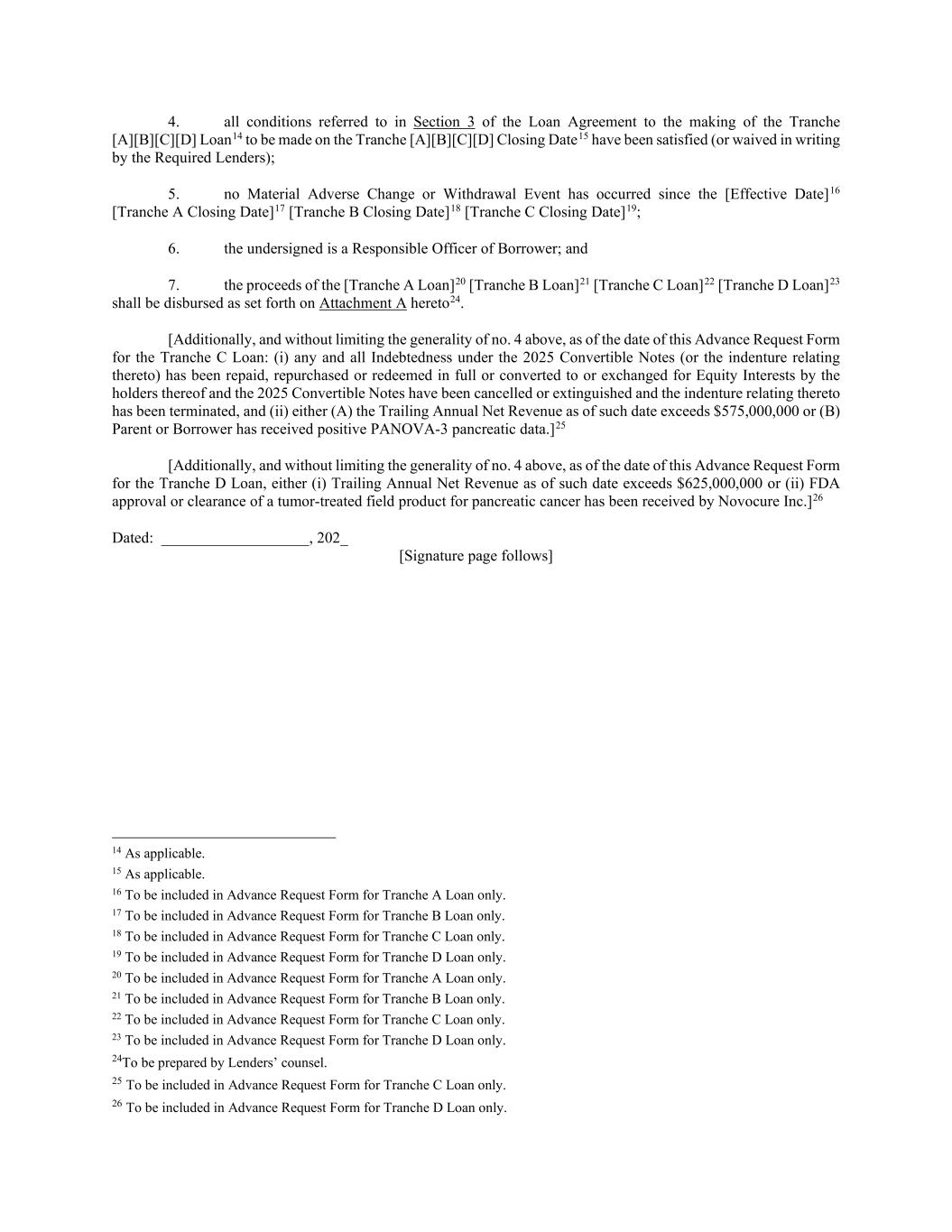 4. all conditions referred to in Section 3 of the Loan Agreement to the making of the Tranche [A][B][C][D] Loan14 to be made on the Tranche [A][B][C][D] Closing Date15 have been satisfied (or waived in writing by the Required Lenders); 5. no Material Adverse Change or Withdrawal Event has occurred since the [Effective Date]16 [Tranche A Closing Date]17 [Tranche B Closing Date]18 [Tranche C Closing Date]19; 6. the undersigned is a Responsible Officer of Borrower; and 7. the proceeds of the [Tranche A Loan]20 [Tranche B Loan]21 [Tranche C Loan]22 [Tranche D Loan]23 shall be disbursed as set forth on Attachment A hereto24. [Additionally, and without limiting the generality of no. 4 above, as of the date of this Advance Request Form for the Tranche C Loan: (i) any and all Indebtedness under the 2025 Convertible Notes (or the indenture relating thereto) has been repaid, repurchased or redeemed in full or converted to or exchanged for Equity Interests by the holders thereof and the 2025 Convertible Notes have been cancelled or extinguished and the indenture relating thereto has been terminated, and (ii) either (A) the Trailing Annual Net Revenue as of such date exceeds $575,000,000 or (B) Parent or Borrower has received positive PANOVA-3 pancreatic data.]25 [Additionally, and without limiting the generality of no. 4 above, as of the date of this Advance Request Form for the Tranche D Loan, either (i) Trailing Annual Net Revenue as of such date exceeds $625,000,000 or (ii) FDA approval or clearance of a tumor-treated field product for pancreatic cancer has been received by Novocure Inc.]26 Dated: ___________________, 202_ [Signature page follows] 14 As applicable. 15 As applicable. 16 To be included in Advance Request Form for Tranche A Loan only. 17 To be included in Advance Request Form for Tranche B Loan only. 18 To be included in Advance Request Form for Tranche C Loan only. 19 To be included in Advance Request Form for Tranche D Loan only. 20 To be included in Advance Request Form for Tranche A Loan only. 21 To be included in Advance Request Form for Tranche B Loan only. 22 To be included in Advance Request Form for Tranche C Loan only. 23 To be included in Advance Request Form for Tranche D Loan only. 24To be prepared by Lenders’ counsel. 25 To be included in Advance Request Form for Tranche C Loan only. 26 To be included in Advance Request Form for Tranche D Loan only.