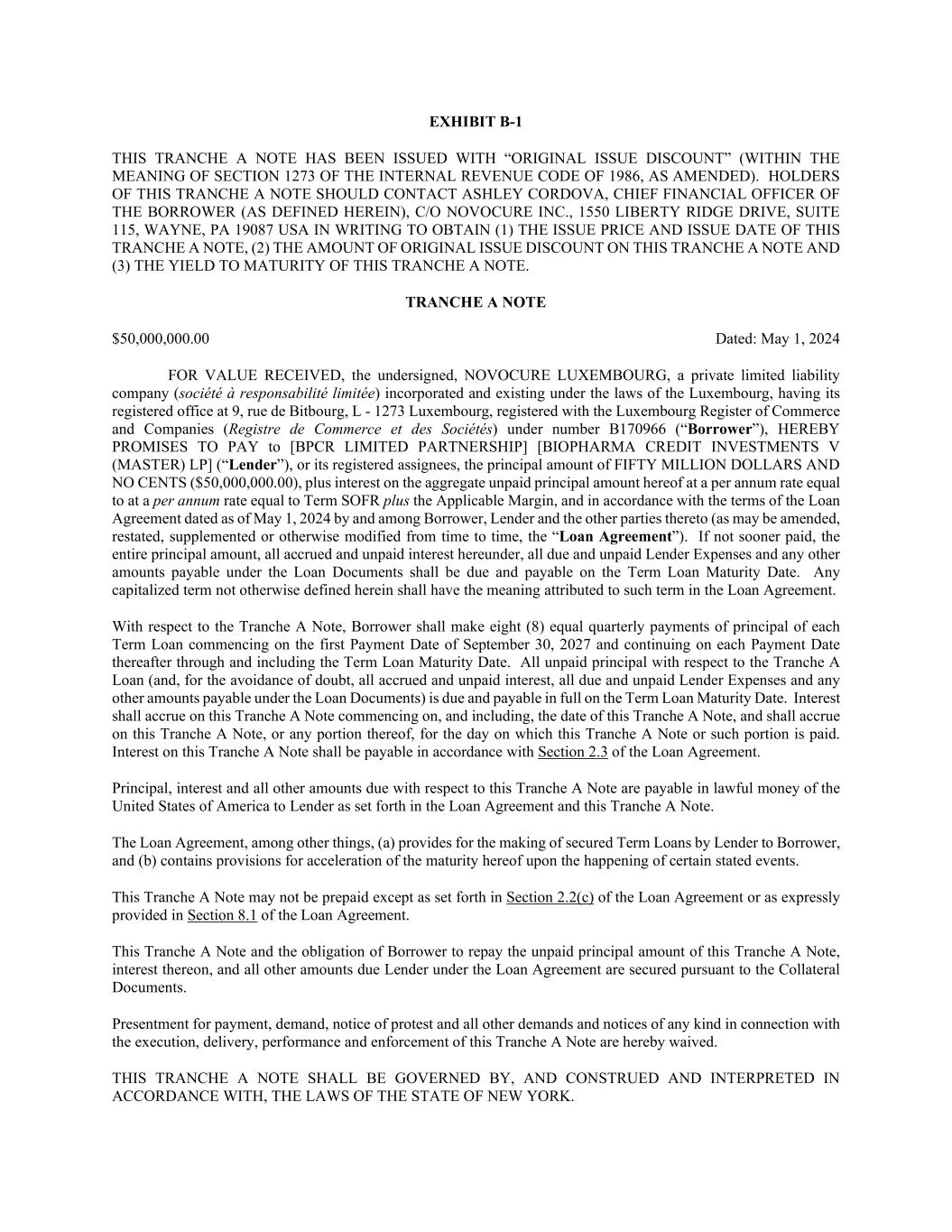 EXHIBIT B-1 THIS TRANCHE A NOTE HAS BEEN ISSUED WITH “ORIGINAL ISSUE DISCOUNT” (WITHIN THE MEANING OF SECTION 1273 OF THE INTERNAL REVENUE CODE OF 1986, AS AMENDED). HOLDERS OF THIS TRANCHE A NOTE SHOULD CONTACT ASHLEY CORDOVA, CHIEF FINANCIAL OFFICER OF THE BORROWER (AS DEFINED HEREIN), C/O NOVOCURE INC., 1550 LIBERTY RIDGE DRIVE, SUITE 115, WAYNE, PA 19087 USA IN WRITING TO OBTAIN (1) THE ISSUE PRICE AND ISSUE DATE OF THIS TRANCHE A NOTE, (2) THE AMOUNT OF ORIGINAL ISSUE DISCOUNT ON THIS TRANCHE A NOTE AND (3) THE YIELD TO MATURITY OF THIS TRANCHE A NOTE. TRANCHE A NOTE $50,000,000.00 Dated: May 1, 2024 FOR VALUE RECEIVED, the undersigned, NOVOCURE LUXEMBOURG, a private limited liability company (société à responsabilité limitée) incorporated and existing under the laws of the Luxembourg, having its registered office at 9, rue de Bitbourg, L - 1273 Luxembourg, registered with the Luxembourg Register of Commerce and Companies (Registre de Commerce et des Sociétés) under number B170966 (“Borrower”), HEREBY PROMISES TO PAY to [BPCR LIMITED PARTNERSHIP] [BIOPHARMA CREDIT INVESTMENTS V (MASTER) LP] (“Lender”), or its registered assignees, the principal amount of FIFTY MILLION DOLLARS AND NO CENTS ($50,000,000.00), plus interest on the aggregate unpaid principal amount hereof at a per annum rate equal to at a per annum rate equal to Term SOFR plus the Applicable Margin, and in accordance with the terms of the Loan Agreement dated as of May 1, 2024 by and among Borrower, Lender and the other parties thereto (as may be amended, restated, supplemented or otherwise modified from time to time, the “Loan Agreement”). If not sooner paid, the entire principal amount, all accrued and unpaid interest hereunder, all due and unpaid Lender Expenses and any other amounts payable under the Loan Documents shall be due and payable on the Term Loan Maturity Date. Any capitalized term not otherwise defined herein shall have the meaning attributed to such term in the Loan Agreement. With respect to the Tranche A Note, Borrower shall make eight (8) equal quarterly payments of principal of each Term Loan commencing on the first Payment Date of September 30, 2027 and continuing on each Payment Date thereafter through and including the Term Loan Maturity Date. All unpaid principal with respect to the Tranche A Loan (and, for the avoidance of doubt, all accrued and unpaid interest, all due and unpaid Lender Expenses and any other amounts payable under the Loan Documents) is due and payable in full on the Term Loan Maturity Date. Interest shall accrue on this Tranche A Note commencing on, and including, the date of this Tranche A Note, and shall accrue on this Tranche A Note, or any portion thereof, for the day on which this Tranche A Note or such portion is paid. Interest on this Tranche A Note shall be payable in accordance with Section 2.3 of the Loan Agreement. Principal, interest and all other amounts due with respect to this Tranche A Note are payable in lawful money of the United States of America to Lender as set forth in the Loan Agreement and this Tranche A Note. The Loan Agreement, among other things, (a) provides for the making of secured Term Loans by Lender to Borrower, and (b) contains provisions for acceleration of the maturity hereof upon the happening of certain stated events. This Tranche A Note may not be prepaid except as set forth in Section 2.2(c) of the Loan Agreement or as expressly provided in Section 8.1 of the Loan Agreement. This Tranche A Note and the obligation of Borrower to repay the unpaid principal amount of this Tranche A Note, interest thereon, and all other amounts due Lender under the Loan Agreement are secured pursuant to the Collateral Documents. Presentment for payment, demand, notice of protest and all other demands and notices of any kind in connection with the execution, delivery, performance and enforcement of this Tranche A Note are hereby waived. THIS TRANCHE A NOTE SHALL BE GOVERNED BY, AND CONSTRUED AND INTERPRETED IN ACCORDANCE WITH, THE LAWS OF THE STATE OF NEW YORK.