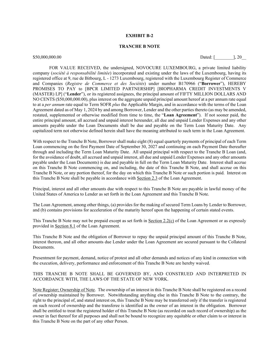 EXHIBIT B-2 TRANCHE B NOTE $50,000,000.00 Dated: [________], 20__ FOR VALUE RECEIVED, the undersigned, NOVOCURE LUXEMBOURG, a private limited liability company (société à responsabilité limitée) incorporated and existing under the laws of the Luxembourg, having its registered office at 9, rue de Bitbourg, L - 1273 Luxembourg, registered with the Luxembourg Register of Commerce and Companies (Registre de Commerce et des Sociétés) under number B170966 (“Borrower”), HEREBY PROMISES TO PAY to [BPCR LIMITED PARTNERSHIP] [BIOPHARMA CREDIT INVESTMENTS V (MASTER) LP] (“Lender”), or its registered assignees, the principal amount of FIFTY MILLION DOLLARS AND NO CENTS ($50,000,000.00), plus interest on the aggregate unpaid principal amount hereof at a per annum rate equal to at a per annum rate equal to Term SOFR plus the Applicable Margin, and in accordance with the terms of the Loan Agreement dated as of May 1, 2024 by and among Borrower, Lender and the other parties thereto (as may be amended, restated, supplemented or otherwise modified from time to time, the “Loan Agreement”). If not sooner paid, the entire principal amount, all accrued and unpaid interest hereunder, all due and unpaid Lender Expenses and any other amounts payable under the Loan Documents shall be due and payable on the Term Loan Maturity Date. Any capitalized term not otherwise defined herein shall have the meaning attributed to such term in the Loan Agreement. With respect to the Tranche B Note, Borrower shall make eight (8) equal quarterly payments of principal of each Term Loan commencing on the first Payment Date of September 30, 2027 and continuing on each Payment Date thereafter through and including the Term Loan Maturity Date. All unpaid principal with respect to the Tranche B Loan (and, for the avoidance of doubt, all accrued and unpaid interest, all due and unpaid Lender Expenses and any other amounts payable under the Loan Documents) is due and payable in full on the Term Loan Maturity Date. Interest shall accrue on this Tranche B Note commencing on, and including, the date of this Tranche B Note, and shall accrue on this Tranche B Note, or any portion thereof, for the day on which this Tranche B Note or such portion is paid. Interest on this Tranche B Note shall be payable in accordance with Section 2.3 of the Loan Agreement. Principal, interest and all other amounts due with respect to this Tranche B Note are payable in lawful money of the United States of America to Lender as set forth in the Loan Agreement and this Tranche B Note. The Loan Agreement, among other things, (a) provides for the making of secured Term Loans by Lender to Borrower, and (b) contains provisions for acceleration of the maturity hereof upon the happening of certain stated events. This Tranche B Note may not be prepaid except as set forth in Section 2.2(c) of the Loan Agreement or as expressly provided in Section 8.1 of the Loan Agreement. This Tranche B Note and the obligation of Borrower to repay the unpaid principal amount of this Tranche B Note, interest thereon, and all other amounts due Lender under the Loan Agreement are secured pursuant to the Collateral Documents. Presentment for payment, demand, notice of protest and all other demands and notices of any kind in connection with the execution, delivery, performance and enforcement of this Tranche B Note are hereby waived. THIS TRANCHE B NOTE SHALL BE GOVERNED BY, AND CONSTRUED AND INTERPRETED IN ACCORDANCE WITH, THE LAWS OF THE STATE OF NEW YORK. Note Register; Ownership of Note. The ownership of an interest in this Tranche B Note shall be registered on a record of ownership maintained by Borrower. Notwithstanding anything else in this Tranche B Note to the contrary, the right to the principal of, and stated interest on, this Tranche B Note may be transferred only if the transfer is registered on such record of ownership and the transferee is identified as the owner of an interest in the obligation. Borrower shall be entitled to treat the registered holder of this Tranche B Note (as recorded on such record of ownership) as the owner in fact thereof for all purposes and shall not be bound to recognize any equitable or other claim to or interest in this Tranche B Note on the part of any other Person.