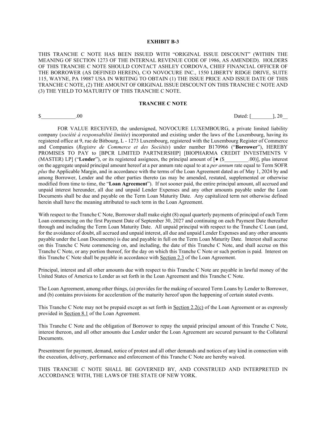 EXHIBIT B-3 THIS TRANCHE C NOTE HAS BEEN ISSUED WITH “ORIGINAL ISSUE DISCOUNT” (WITHIN THE MEANING OF SECTION 1273 OF THE INTERNAL REVENUE CODE OF 1986, AS AMENDED). HOLDERS OF THIS TRANCHE C NOTE SHOULD CONTACT ASHLEY CORDOVA, CHIEF FINANCIAL OFFICER OF THE BORROWER (AS DEFINED HEREIN), C/O NOVOCURE INC., 1550 LIBERTY RIDGE DRIVE, SUITE 115, WAYNE, PA 19087 USA IN WRITING TO OBTAIN (1) THE ISSUE PRICE AND ISSUE DATE OF THIS TRANCHE C NOTE, (2) THE AMOUNT OF ORIGINAL ISSUE DISCOUNT ON THIS TRANCHE C NOTE AND (3) THE YIELD TO MATURITY OF THIS TRANCHE C NOTE. TRANCHE C NOTE $_____________.00 Dated: [________], 20__ FOR VALUE RECEIVED, the undersigned, NOVOCURE LUXEMBOURG, a private limited liability company (société à responsabilité limitée) incorporated and existing under the laws of the Luxembourg, having its registered office at 9, rue de Bitbourg, L - 1273 Luxembourg, registered with the Luxembourg Register of Commerce and Companies (Registre de Commerce et des Sociétés) under number B170966 (“Borrower”), HEREBY PROMISES TO PAY to [BPCR LIMITED PARTNERSHIP] [BIOPHARMA CREDIT INVESTMENTS V (MASTER) LP] (“Lender”), or its registered assignees, the principal amount of [● ($_________.00)], plus interest on the aggregate unpaid principal amount hereof at a per annum rate equal to at a per annum rate equal to Term SOFR plus the Applicable Margin, and in accordance with the terms of the Loan Agreement dated as of May 1, 2024 by and among Borrower, Lender and the other parties thereto (as may be amended, restated, supplemented or otherwise modified from time to time, the “Loan Agreement”). If not sooner paid, the entire principal amount, all accrued and unpaid interest hereunder, all due and unpaid Lender Expenses and any other amounts payable under the Loan Documents shall be due and payable on the Term Loan Maturity Date. Any capitalized term not otherwise defined herein shall have the meaning attributed to such term in the Loan Agreement. With respect to the Tranche C Note, Borrower shall make eight (8) equal quarterly payments of principal of each Term Loan commencing on the first Payment Date of September 30, 2027 and continuing on each Payment Date thereafter through and including the Term Loan Maturity Date. All unpaid principal with respect to the Tranche C Loan (and, for the avoidance of doubt, all accrued and unpaid interest, all due and unpaid Lender Expenses and any other amounts payable under the Loan Documents) is due and payable in full on the Term Loan Maturity Date. Interest shall accrue on this Tranche C Note commencing on, and including, the date of this Tranche C Note, and shall accrue on this Tranche C Note, or any portion thereof, for the day on which this Tranche C Note or such portion is paid. Interest on this Tranche C Note shall be payable in accordance with Section 2.3 of the Loan Agreement. Principal, interest and all other amounts due with respect to this Tranche C Note are payable in lawful money of the United States of America to Lender as set forth in the Loan Agreement and this Tranche C Note. The Loan Agreement, among other things, (a) provides for the making of secured Term Loans by Lender to Borrower, and (b) contains provisions for acceleration of the maturity hereof upon the happening of certain stated events. This Tranche C Note may not be prepaid except as set forth in Section 2.2(c) of the Loan Agreement or as expressly provided in Section 8.1 of the Loan Agreement. This Tranche C Note and the obligation of Borrower to repay the unpaid principal amount of this Tranche C Note, interest thereon, and all other amounts due Lender under the Loan Agreement are secured pursuant to the Collateral Documents. Presentment for payment, demand, notice of protest and all other demands and notices of any kind in connection with the execution, delivery, performance and enforcement of this Tranche C Note are hereby waived. THIS TRANCHE C NOTE SHALL BE GOVERNED BY, AND CONSTRUED AND INTERPRETED IN ACCORDANCE WITH, THE LAWS OF THE STATE OF NEW YORK.