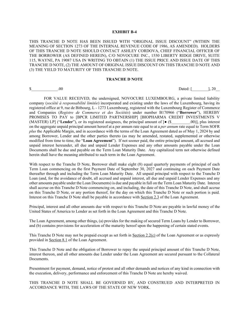 EXHIBIT B-4 THIS TRANCHE D NOTE HAS BEEN ISSUED WITH “ORIGINAL ISSUE DISCOUNT” (WITHIN THE MEANING OF SECTION 1273 OF THE INTERNAL REVENUE CODE OF 1986, AS AMENDED). HOLDERS OF THIS TRANCHE D NOTE SHOULD CONTACT ASHLEY CORDOVA, CHIEF FINANCIAL OFFICER OF THE BORROWER (AS DEFINED HEREIN), C/O NOVOCURE INC., 1550 LIBERTY RIDGE DRIVE, SUITE 115, WAYNE, PA 19087 USA IN WRITING TO OBTAIN (1) THE ISSUE PRICE AND ISSUE DATE OF THIS TRANCHE D NOTE, (2) THE AMOUNT OF ORIGINAL ISSUE DISCOUNT ON THIS TRANCHE D NOTE AND (3) THE YIELD TO MATURITY OF THIS TRANCHE D NOTE. TRANCHE D NOTE $_____________.00 Dated: [________], 20__ FOR VALUE RECEIVED, the undersigned, NOVOCURE LUXEMBOURG, a private limited liability company (société à responsabilité limitée) incorporated and existing under the laws of the Luxembourg, having its registered office at 9, rue de Bitbourg, L - 1273 Luxembourg, registered with the Luxembourg Register of Commerce and Companies (Registre de Commerce et des Sociétés) under number B170966 (“Borrower”), HEREBY PROMISES TO PAY to [BPCR LIMITED PARTNERSHIP] [BIOPHARMA CREDIT INVESTMENTS V (MASTER) LP] (“Lender”), or its registered assignees, the principal amount of [● ($_________.00)], plus interest on the aggregate unpaid principal amount hereof at a per annum rate equal to at a per annum rate equal to Term SOFR plus the Applicable Margin, and in accordance with the terms of the Loan Agreement dated as of May 1, 2024 by and among Borrower, Lender and the other parties thereto (as may be amended, restated, supplemented or otherwise modified from time to time, the “Loan Agreement”). If not sooner paid, the entire principal amount, all accrued and unpaid interest hereunder, all due and unpaid Lender Expenses and any other amounts payable under the Loan Documents shall be due and payable on the Term Loan Maturity Date. Any capitalized term not otherwise defined herein shall have the meaning attributed to such term in the Loan Agreement. With respect to the Tranche D Note, Borrower shall make eight (8) equal quarterly payments of principal of each Term Loan commencing on the first Payment Date of September 30, 2027 and continuing on each Payment Date thereafter through and including the Term Loan Maturity Date. All unpaid principal with respect to the Tranche D Loan (and, for the avoidance of doubt, all accrued and unpaid interest, all due and unpaid Lender Expenses and any other amounts payable under the Loan Documents) is due and payable in full on the Term Loan Maturity Date. Interest shall accrue on this Tranche D Note commencing on, and including, the date of this Tranche D Note, and shall accrue on this Tranche D Note, or any portion thereof, for the day on which this Tranche D Note or such portion is paid. Interest on this Tranche D Note shall be payable in accordance with Section 2.3 of the Loan Agreement. Principal, interest and all other amounts due with respect to this Tranche D Note are payable in lawful money of the United States of America to Lender as set forth in the Loan Agreement and this Tranche D Note. The Loan Agreement, among other things, (a) provides for the making of secured Term Loans by Lender to Borrower, and (b) contains provisions for acceleration of the maturity hereof upon the happening of certain stated events. This Tranche D Note may not be prepaid except as set forth in Section 2.2(c) of the Loan Agreement or as expressly provided in Section 8.1 of the Loan Agreement. This Tranche D Note and the obligation of Borrower to repay the unpaid principal amount of this Tranche D Note, interest thereon, and all other amounts due Lender under the Loan Agreement are secured pursuant to the Collateral Documents. Presentment for payment, demand, notice of protest and all other demands and notices of any kind in connection with the execution, delivery, performance and enforcement of this Tranche D Note are hereby waived. THIS TRANCHE D NOTE SHALL BE GOVERNED BY, AND CONSTRUED AND INTERPRETED IN ACCORDANCE WITH, THE LAWS OF THE STATE OF NEW YORK.