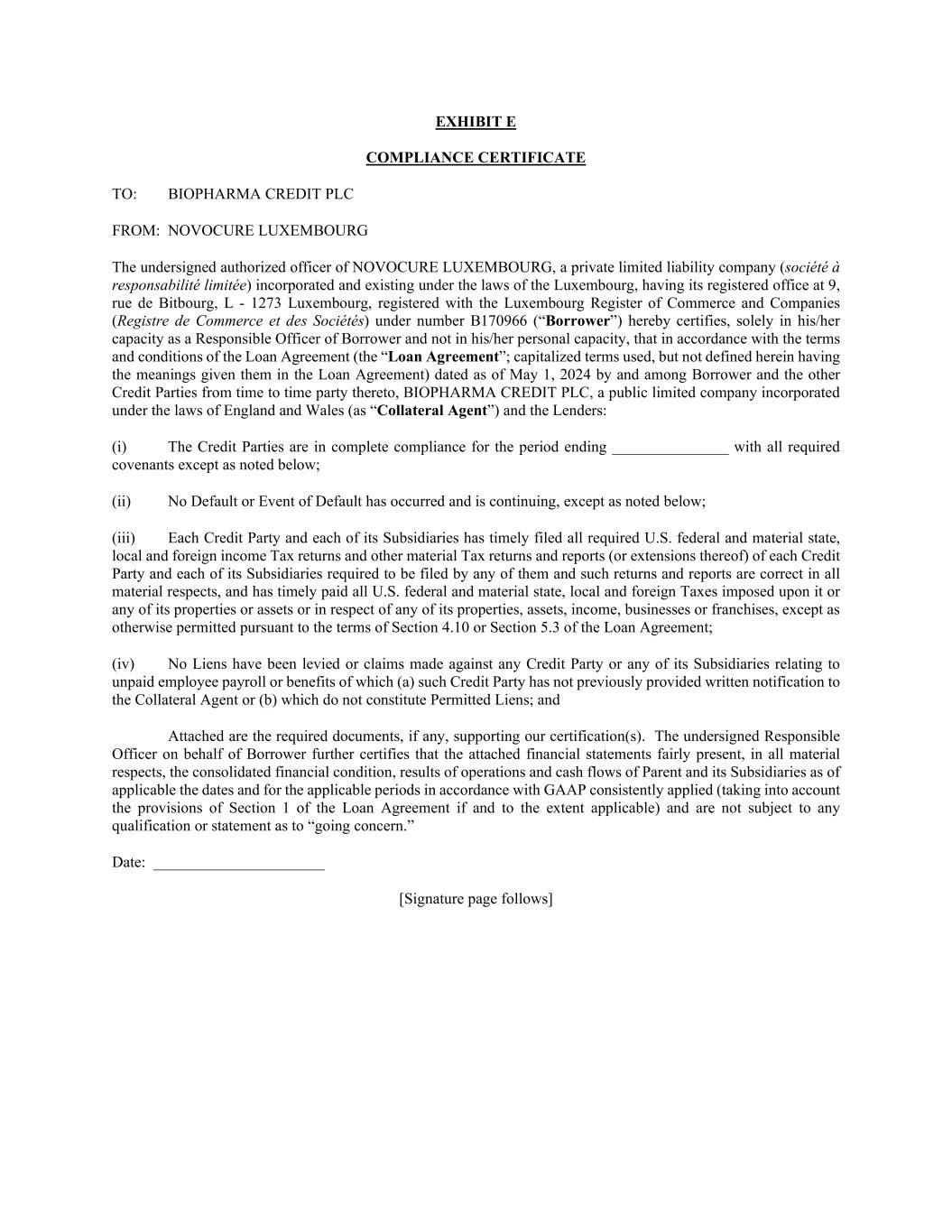 EXHIBIT E COMPLIANCE CERTIFICATE TO: BIOPHARMA CREDIT PLC FROM: NOVOCURE LUXEMBOURG The undersigned authorized officer of NOVOCURE LUXEMBOURG, a private limited liability company (société à responsabilité limitée) incorporated and existing under the laws of the Luxembourg, having its registered office at 9, rue de Bitbourg, L - 1273 Luxembourg, registered with the Luxembourg Register of Commerce and Companies (Registre de Commerce et des Sociétés) under number B170966 (“Borrower”) hereby certifies, solely in his/her capacity as a Responsible Officer of Borrower and not in his/her personal capacity, that in accordance with the terms and conditions of the Loan Agreement (the “Loan Agreement”; capitalized terms used, but not defined herein having the meanings given them in the Loan Agreement) dated as of May 1, 2024 by and among Borrower and the other Credit Parties from time to time party thereto, BIOPHARMA CREDIT PLC, a public limited company incorporated under the laws of England and Wales (as “Collateral Agent”) and the Lenders: (i) The Credit Parties are in complete compliance for the period ending _______________ with all required covenants except as noted below; (ii) No Default or Event of Default has occurred and is continuing, except as noted below; (iii) Each Credit Party and each of its Subsidiaries has timely filed all required U.S. federal and material state, local and foreign income Tax returns and other material Tax returns and reports (or extensions thereof) of each Credit Party and each of its Subsidiaries required to be filed by any of them and such returns and reports are correct in all material respects, and has timely paid all U.S. federal and material state, local and foreign Taxes imposed upon it or any of its properties or assets or in respect of any of its properties, assets, income, businesses or franchises, except as otherwise permitted pursuant to the terms of Section 4.10 or Section 5.3 of the Loan Agreement; (iv) No Liens have been levied or claims made against any Credit Party or any of its Subsidiaries relating to unpaid employee payroll or benefits of which (a) such Credit Party has not previously provided written notification to the Collateral Agent or (b) which do not constitute Permitted Liens; and Attached are the required documents, if any, supporting our certification(s). The undersigned Responsible Officer on behalf of Borrower further certifies that the attached financial statements fairly present, in all material respects, the consolidated financial condition, results of operations and cash flows of Parent and its Subsidiaries as of applicable the dates and for the applicable periods in accordance with GAAP consistently applied (taking into account the provisions of Section 1 of the Loan Agreement if and to the extent applicable) and are not subject to any qualification or statement as to “going concern.” Date: ______________________ [Signature page follows]