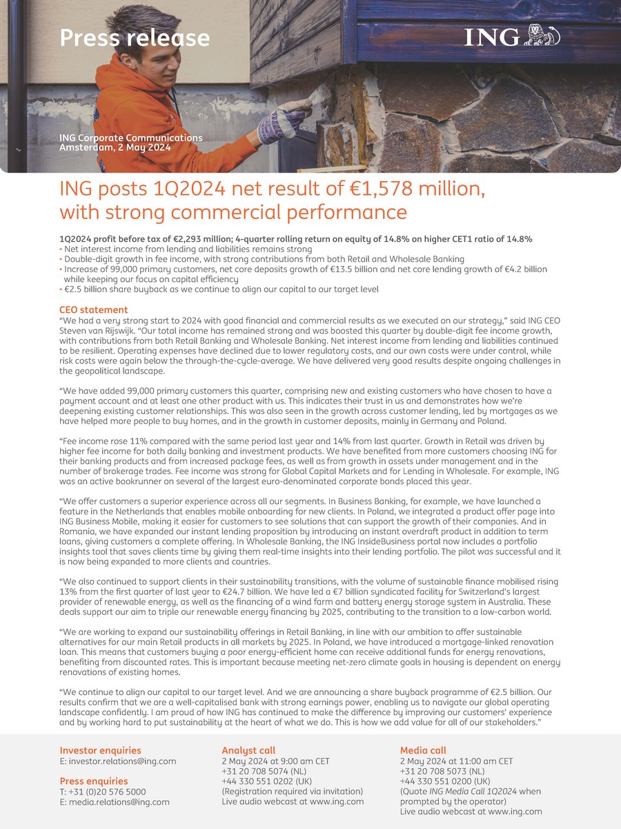Press release ING Corporate Communications Amsterdam, 2 May 2024 ING posts 1Q2024 net result of €1,578 million, with strong commercial performance 1Q2024 profit before tax of €2,293 million; 4 - quarter rolling return on equity of 14.8% on higher CET1 ratio of 14.8% • Net interest income from lending and liabilities remains strong • Double - digit growth in fee income, with strong contributions from both Retail and Wholesale Banking • Increase of 99,000 primary customers, net core deposits growth of €13.5 billion and net core lending growth of €4.2 billion while keeping our focus on capital efficiency • €2.5 billion share buyback as we continue to align our capital to our target level CEO statement “We had a very strong start to 2024 with good financial and commercial results as we executed on our strategy,” said ING CEO Steven van Rijswijk. “Our total income has remained strong and was boosted this quarter by double - digit fee income growth, with contributions from both Retail Banking and Wholesale Banking. Net interest income from lending and liabilities continued to be resilient. Operating expenses have declined due to lower regulatory costs, and our own costs were under control, while risk costs were again below the through - the - cycle - average. We have delivered very good results despite ongoing challenges in the geopolitical landscape. “We have added 99,000 primary customers this quarter, comprising new and existing customers who have chosen to have a payment account and at least one other product with us. This indicates their trust in us and demonstrates how we’re deepening existing customer relationships. This was also seen in the growth across customer lending, led by mortgages as we have helped more people to buy homes, and in the growth in customer deposits, mainly in Germany and Poland. “Fee income rose 11% compared with the same period last year and 14% from last quarter. Growth in Retail was driven by higher fee income for both daily banking and investment products. We have benefited from more customers choosing ING for their banking products and from increased package fees, as well as from growth in assets under management and in the number of brokerage trades. Fee income was strong for Global Capital Markets and for Lending in Wholesale. For example, ING was an active bookrunner on several of the largest euro - denominated corporate bonds placed this year. “We offer customers a superior experience across all our segments. In Business Banking, for example, we have launched a feature in the Netherlands that enables mobile onboarding for new clients. In Poland, we integrated a product offer page into ING Business Mobile, making it easier for customers to see solutions that can support the growth of their companies. And in Romania, we have expanded our instant lending proposition by introducing an instant overdraft product in addition to term loans, giving customers a complete offering. In Wholesale Banking, the ING InsideBusiness portal now includes a portfolio insights tool that saves clients time by giving them real - time insights into their lending portfolio. The pilot was successful and it is now being expanded to more clients and countries. “We also continued to support clients in their sustainability transitions, with the volume of sustainable finance mobilised rising 13% from the first quarter of last year to €24.7 billion. We have led a €7 billion syndicated facility for Switzerland’s largest provider of renewable energy, as well as the financing of a wind farm and battery energy storage system in Australia. These deals support our aim to triple our renewable energy financing by 2025, contributing to the transition to a low - carbon world. “We are working to expand our sustainability offerings in Retail Banking, in line with our ambition to offer sustainable alternatives for our main Retail products in all markets by 2025. In Poland, we have introduced a mortgage - linked renovation loan. This means that customers buying a poor energy - efficient home can receive additional funds for energy renovations, benefiting from discounted rates. This is important because meeting net - zero climate goals in housing is dependent on energy renovations of existing homes. “We continue to align our capital to our target level . And we are announcing a share buyback programme of € 2 . 5 billion . Our results confirm that we are a well - capitalised bank with strong earnings power, enabling us to navigate our global operating landscape confidently . I am proud of how ING has continued to make the difference by improving our customers’ experience and by working hard to put sustainability at the heart of what we do . This is how we add value for all of our stakeholders . ” Investor enquiries E: investor.relations@ing.com Press enquiries T: +31 (0)20 576 5000 E: media.relations@ing.com Analyst call 2 May 2024 at 9:00 am CET +31 20 708 5074 (NL) +44 330 551 0202 (UK) (Registration required via invitation) Live audio webcast at www.ing.com Media call 2 May 2024 at 11:00 am CET +31 20 708 5073 (NL) +44 330 551 0200 (UK) (Quote ING Media Call 1Q2024 when prompted by the operator) Live audio webcast at www.ing.com