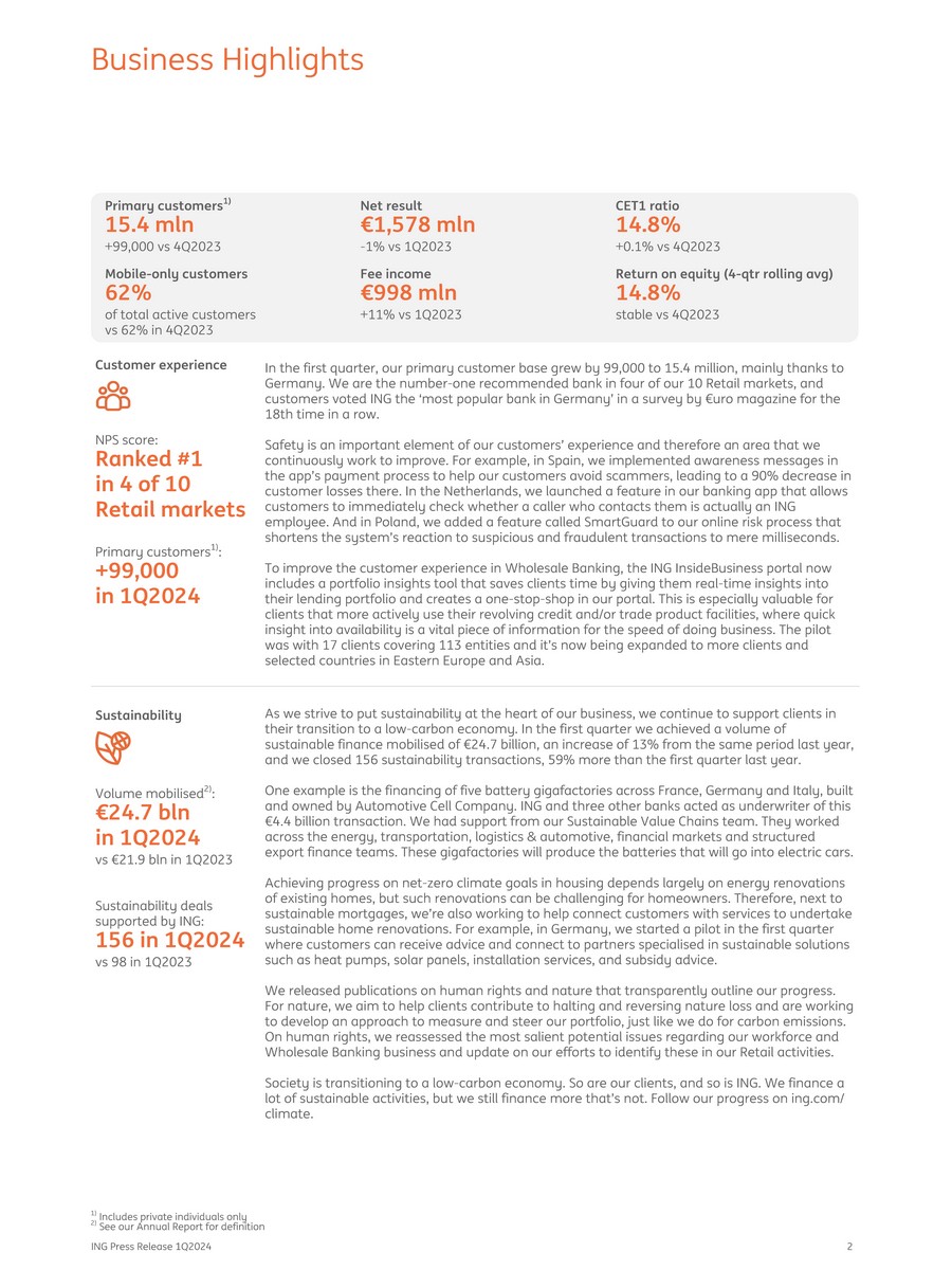 Primary customers 1) 15.4 mln +99,000 vs 4Q2023 Mobile - only customers 62% of total active customers vs 62% in 4Q2023 Net result €1,578 mln - 1% vs 1Q2023 Fee income €998 mln +11% vs 1Q2023 CET1 ratio 14.8% +0.1% vs 4Q2023 Return on equity (4 - qtr rolling avg) 14.8% stable vs 4Q2023 Customer experience NPS score: Ranked #1 in 4 of 10 Retail markets Primary customers 1) : +99,000 in 1Q2024 Sustainability Volume mobilised 2) : €24.7 bln in 1Q2024 vs €21.9 bln in 1Q2023 ING Press Release 1Q2024 2 Sustainability deals supported by ING: 156 in 1Q2024 vs 98 in 1Q2023 Business Highlights In the first quarter, our primary customer base grew by 99,000 to 15.4 million, mainly thanks to Germany. We are the number - one recommended bank in four of our 10 Retail markets, and customers voted ING the ‘most popular bank in Germany’ in a survey by €uro magazine for the 18th time in a row. Safety is an important element of our customers’ experience and therefore an area that we continuously work to improve. For example, in Spain, we implemented awareness messages in the app’s payment process to help our customers avoid scammers, leading to a 90% decrease in customer losses there. In the Netherlands, we launched a feature in our banking app that allows customers to immediately check whether a caller who contacts them is actually an ING employee. And in Poland, we added a feature called SmartGuard to our online risk process that shortens the system’s reaction to suspicious and fraudulent transactions to mere milliseconds. To improve the customer experience in Wholesale Banking, the ING InsideBusiness portal now includes a portfolio insights tool that saves clients time by giving them real - time insights into their lending portfolio and creates a one - stop - shop in our portal. This is especially valuable for clients that more actively use their revolving credit and/or trade product facilities, where quick insight into availability is a vital piece of information for the speed of doing business. The pilot was with 17 clients covering 113 entities and it’s now being expanded to more clients and selected countries in Eastern Europe and Asia. 1) Includes private individuals only 2) See our Annual Report for definition As we strive to put sustainability at the heart of our business, we continue to support clients in their transition to a low - carbon economy. In the first quarter we achieved a volume of sustainable finance mobilised of €24.7 billion, an increase of 13% from the same period last year, and we closed 156 sustainability transactions, 59% more than the first quarter last year. One example is the financing of five battery gigafactories across France, Germany and Italy, built and owned by Automotive Cell Company. ING and three other banks acted as underwriter of this €4.4 billion transaction. We had support from our Sustainable Value Chains team. They worked across the energy, transportation, logistics & automotive, financial markets and structured export finance teams. These gigafactories will produce the batteries that will go into electric cars. Achieving progress on net - zero climate goals in housing depends largely on energy renovations of existing homes, but such renovations can be challenging for homeowners. Therefore, next to sustainable mortgages, we’re also working to help connect customers with services to undertake sustainable home renovations. For example, in Germany, we started a pilot in the first quarter where customers can receive advice and connect to partners specialised in sustainable solutions such as heat pumps, solar panels, installation services, and subsidy advice. We released publications on human rights and nature that transparently outline our progress. For nature, we aim to help clients contribute to halting and reversing nature loss and are working to develop an approach to measure and steer our portfolio, just like we do for carbon emissions. On human rights, we reassessed the most salient potential issues regarding our workforce and Wholesale Banking business and update on our efforts to identify these in our Retail activities. Society is transitioning to a low - carbon economy . So are our clients, and so is ING . We finance a lot of sustainable activities, but we still finance more that’s not . Follow our progress on ing . com/ climate .