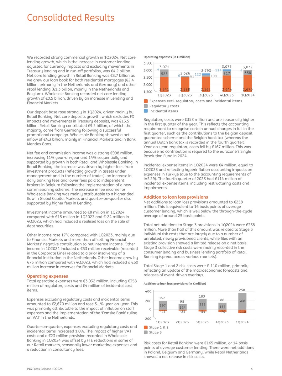 We recorded strong commercial growth in 1Q2024. Net core lending growth, which is the increase in customer lending adjusted for currency impacts and excluding movements in Treasury lending and in run - off portfolios, was €4.2 billion. Net core lending growth in Retail Banking was €3.7 billion as we grew our loan book for both residential mortgages (€2.4 billion, primarily in the Netherlands and Germany) and other retail lending (€1.3 billion, mainly in the Netherlands and Belgium). Wholesale Banking recorded net core lending growth of €0.5 billion, driven by an increase in Lending and Financial Markets. Our deposit base rose strongly in 1Q2024, driven mainly by Retail Banking. Net core deposits growth, which excludes FX impacts and movements in Treasury deposits, was €13.5 billion. Retail Banking contributed €9.2 billion, of which the majority came from Germany following a successful promotional campaign. Wholesale Banking showed a net inflow of €4.3 billion, mainly in Financial Markets and in Bank Mendes Gans. Net fee and commission income was a strong €998 million, increasing 11% year - on - year and 14% sequentially and supported by growth in both Retail and Wholesale Banking. In Retail Banking, the increase was driven by higher fees from investment products (reflecting growth in assets under management and in the number of trades), an increase in daily banking fees and lower fees paid to independent brokers in Belgium following the implementation of a new commissioning scheme. The increase in fee income for Wholesale Banking was mainly attributable to a higher deal flow in Global Capital Markets and quarter - on - quarter also supported by higher fees in Lending. Investment income amounted to €8 million in 1Q2024 compared with €15 million in 1Q2023 and € - 24 million in 4Q2023, which had included a realised loss on the sale of debt securities. Other income rose 17% compared with 1Q2023, mainly due to Financial Markets and more than offsetting Financial Markets' negative contribution to net interest income. Other income in 1Q2024 included a €53 million receivable (recorded in the Corporate Line) related to a prior insolvency of a financial institution in the Netherlands. Other income grew by €73 million compared with 4Q2023, which had included a €60 million increase in reserves for Financial Markets. Operating expenses Total operating expenses were €3,032 million, including €358 million of regulatory costs and €4 million of incidental cost items. Expenses excluding regulatory costs and incidental items amounted to €2,670 million and rose 5.1% year - on - year. This was primarily attributable to the impact of inflation on staff expenses and the implementation of the ‘Danske Bank’ ruling on VAT in the Netherlands. Quarter - on - quarter, expenses excluding regulatory costs and incidental items increased 1.0%. The impact of higher VAT costs and a €23 million provision recorded in Wholesale Banking in 1Q2024 was offset by FTE reductions in some of our Retail markets, seasonally lower marketing expenses and a reduction in consultancy fees. Operating expenses (in € million) Regulatory costs were €358 million and are seasonally higher in the first quarter of the year. This reflects the accounting requirement to recognise certain annual charges in full in the first quarter, such as the contributions to the Belgian deposit guarantee scheme and the Belgian bank tax (whereas the annual Dutch bank tax is recorded in the fourth quarter). Year - on - year, regulatory costs fell by € 167 million . This was because no contribution is required to the eurozone's Single Resolution Fund in 2024 . Incidental expense items in 1Q2024 were €4 million, equal to 1Q2023 and reflecting hyperinflation accounting impacts on expenses in Türkiye (due to the accounting requirements of IAS 29). The fourth quarter of 2023 had €114 million of incidental expense items, including restructuring costs and impairments. Addition to loan loss provisions Net additions to loan loss provisions amounted to €258 million. This is equivalent to 16 basis points of average customer lending, which is well below the through - the - cycle average of around 25 basis points. Total net additions to Stage 3 provisions in 1Q2024 were €368 million. More than half of this amount was related to Stage 3 individual risk costs that are largely due to a number of unrelated, newly provisioned clients, while files with an existing provision showed a limited release on a net basis. Stage 3 collective risk costs were mainly recorded in the consumer lending and business lending portfolio of Retail Banking (spread across various markets). Total Stage 1 and 2 risk costs were € - 110 million, primarily reflecting an update of the macroeconomic forecasts and releases of event - driven overlays . Addition to loan loss provisions (in € million) Risk costs for Retail Banking were €165 million, or 14 basis points of average customer lending. There were net additions in Poland, Belgium and Germany, while Retail Netherlands showed a net release in risk costs. ING Press Release 1Q2024 4 Consolidated Results