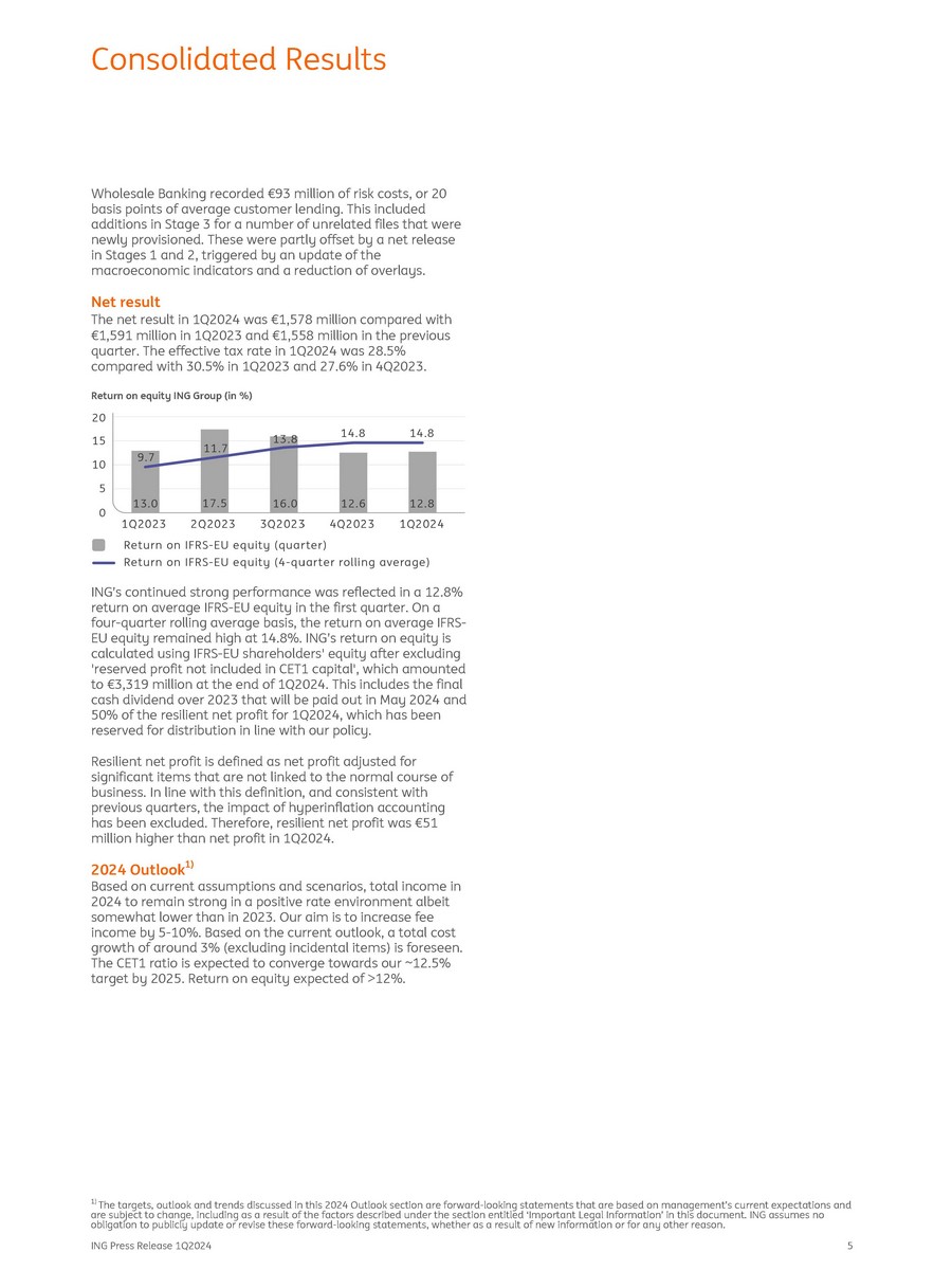 Wholesale Banking recorded €93 million of risk costs, or 20 basis points of average customer lending. This included additions in Stage 3 for a number of unrelated files that were newly provisioned. These were partly offset by a net release in Stages 1 and 2, triggered by an update of the macroeconomic indicators and a reduction of overlays. Net result The net result in 1Q2024 was €1,578 million compared with €1,591 million in 1Q2023 and €1,558 million in the previous quarter. The effective tax rate in 1Q2024 was 28.5% compared with 30.5% in 1Q2023 and 27.6% in 4Q2023. Return on equity ING Group (in %) ING’s continued strong performance was reflected in a 12.8% return on average IFRS - EU equity in the first quarter. On a four - quarter rolling average basis, the return on average IFRS - EU equity remained high at 14.8%. ING’s return on equity is calculated using IFRS - EU shareholders' equity after excluding 'reserved profit not included in CET1 capital', which amounted to €3,319 million at the end of 1Q2024. This includes the final cash dividend over 2023 that will be paid out in May 2024 and 50% of the resilient net profit for 1Q2024, which has been reserved for distribution in line with our policy. Resilient net profit is defined as net profit adjusted for significant items that are not linked to the normal course of business. In line with this definition, and consistent with previous quarters, the impact of hyperinflation accounting has been excluded. Therefore, resilient net profit was €51 million higher than net profit in 1Q2024. 2024 Outlook 1) Based on current assumptions and scenarios, total income in 2024 to remain strong in a positive rate environment albeit somewhat lower than in 2023. Our aim is to increase fee income by 5 - 10%. Based on the current outlook, a total cost growth of around 3% (excluding incidental items) is foreseen. The CET1 ratio is expected to converge towards our ~12.5% target by 2025. Return on equity expected of >12%. ING Press Release 1Q2024 5 Consolidated Results 1) The targets, outlook and trends discussed in this 2024 Outlook section are forward - looking statements that are based on management’s current expectations and are subject to change, including as a result of the factors described under the section entitled ‘Important Legal Information’ in this document. ING assumes no obligation to publicly update or revise these forward - looking statements, whether as a result of new information or for any other reason.