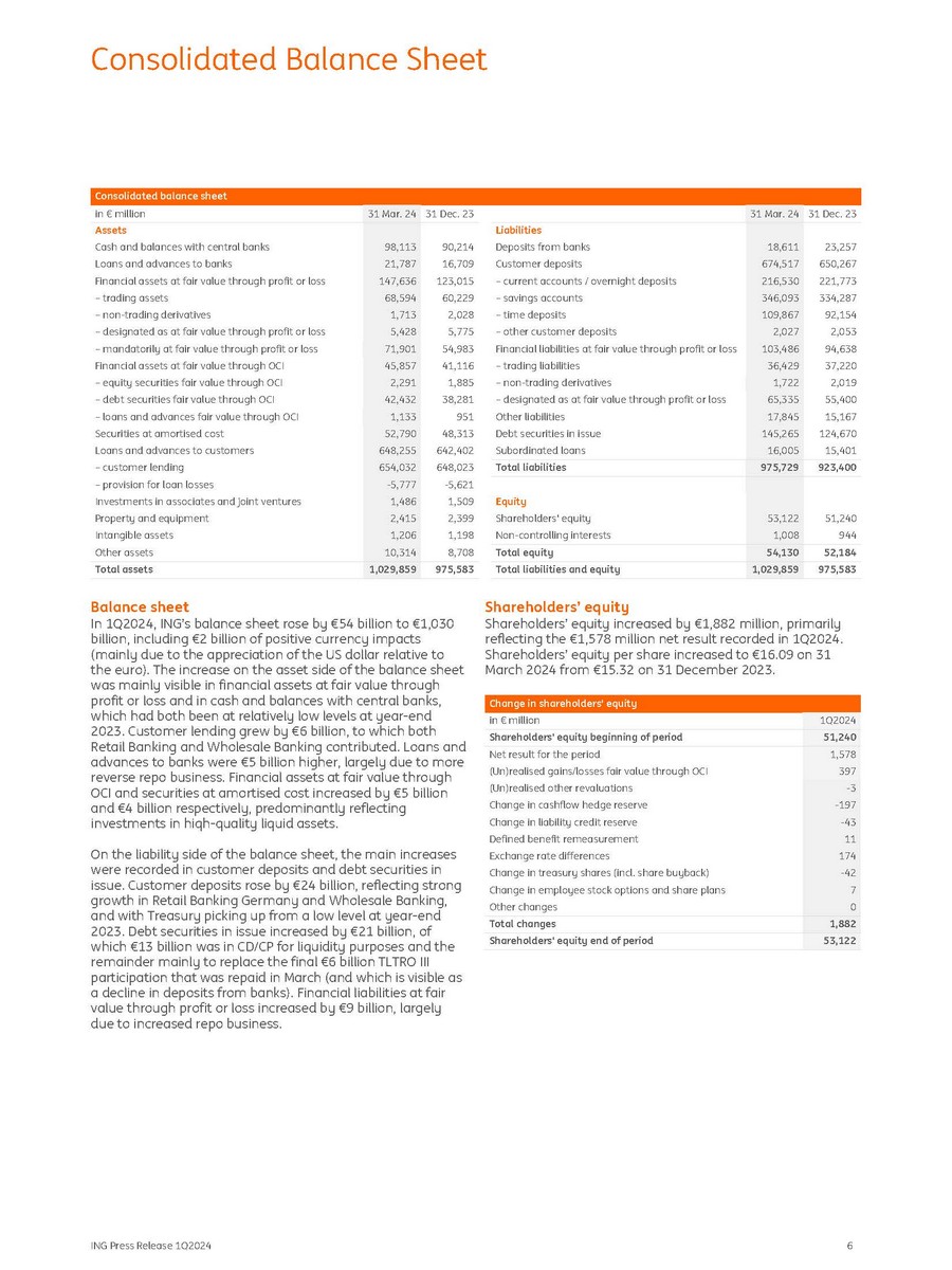 ING Press Release 1Q2024 6 Consolidated balance sheet 31 Dec. 23 31 Mar. 24 31 Dec. 23 31 Mar. 24 in € million Liabilities Assets 23,257 18,611 Deposits from banks 90,214 98,113 Cash and balances with central banks 650,267 674,517 Customer deposits 16,709 21,787 Loans and advances to banks 221,773 216,530 – current accounts / overnight deposits 123,015 147,636 Financial assets at fair value through profit or loss 334,287 346,093 – savings accounts 60,229 68,594 – trading assets 92,154 109,867 – time deposits 2,028 1,713 – non - trading derivatives 2,053 2,027 – other customer deposits 5,775 5,428 – designated as at fair value through profit or loss 94,638 103,486 Financial liabilities at fair value through profit or loss 54,983 71,901 – mandatorily at fair value through profit or loss 37,220 36,429 – trading liabilities 41,116 45,857 Financial assets at fair value through OCI 2,019 1,722 – non - trading derivatives 1,885 2,291 – equity securities fair value through OCI 55,400 65,335 – designated as at fair value through profit or loss 38,281 42,432 – debt securities fair value through OCI 15,167 17,845 Other liabilities 951 1,133 – loans and advances fair value through OCI 124,670 145,265 Debt securities in issue 48,313 52,790 Securities at amortised cost 15,401 16,005 Subordinated loans 642,402 648,255 Loans and advances to customers 923,400 975,729 Total liabilities 648,023 654,032 – customer lending - 5,621 - 5,777 – provision for loan losses Equity 1,509 1,486 Investments in associates and joint ventures 51,240 53,122 Shareholders' equity 2,399 2,415 Property and equipment 944 1,008 Non - controlling interests 1,198 1,206 Intangible assets 52,184 54,130 Total equity 8,708 10,314 Other assets 975,583 1,029,859 Total liabilities and equity 975,583 1,029,859 Total assets Balance sheet In 1Q2024, ING’s balance sheet rose by €54 billion to €1,030 billion, including €2 billion of positive currency impacts (mainly due to the appreciation of the US dollar relative to the euro). The increase on the asset side of the balance sheet was mainly visible in financial assets at fair value through profit or loss and in cash and balances with central banks, which had both been at relatively low levels at year - end 2023. Customer lending grew by €6 billion, to which both Retail Banking and Wholesale Banking contributed. Loans and advances to banks were €5 billion higher, largely due to more reverse repo business. Financial assets at fair value through OCI and securities at amortised cost increased by €5 billion and €4 billion respectively, predominantly reflecting investments in hiqh - quality liquid assets. On the liability side of the balance sheet, the main increases were recorded in customer deposits and debt securities in issue. Customer deposits rose by €24 billion, reflecting strong growth in Retail Banking Germany and Wholesale Banking, and with Treasury picking up from a low level at year - end 2023. Debt securities in issue increased by €21 billion, of which €13 billion was in CD/CP for liquidity purposes and the remainder mainly to replace the final €6 billion TLTRO III participation that was repaid in March (and which is visible as a decline in deposits from banks). Financial liabilities at fair value through profit or loss increased by €9 billion, largely due to increased repo business. Shareholders’ equity Shareholders’ equity increased by €1,882 million, primarily reflecting the €1,578 million net result recorded in 1Q2024. Shareholders’ equity per share increased to €16.09 on 31 March 2024 from €15.32 on 31 December 2023. Change in shareholders’ equity 1Q2024 in € million 51,240 Shareholders' equity beginning of period 1,578 Net result for the period 397 (Un)realised gains/losses fair value through OCI - 3 (Un)realised other revaluations - 197 Change in cashflow hedge reserve - 43 Change in liability credit reserve 11 Defined benefit remeasurement 174 Exchange rate differences - 42 Change in treasury shares (incl. share buyback) 7 Change in employee stock options and share plans 0 Other changes 1,882 Total changes 53,122 Shareholders' equity end of period Consolidated Balance Sheet