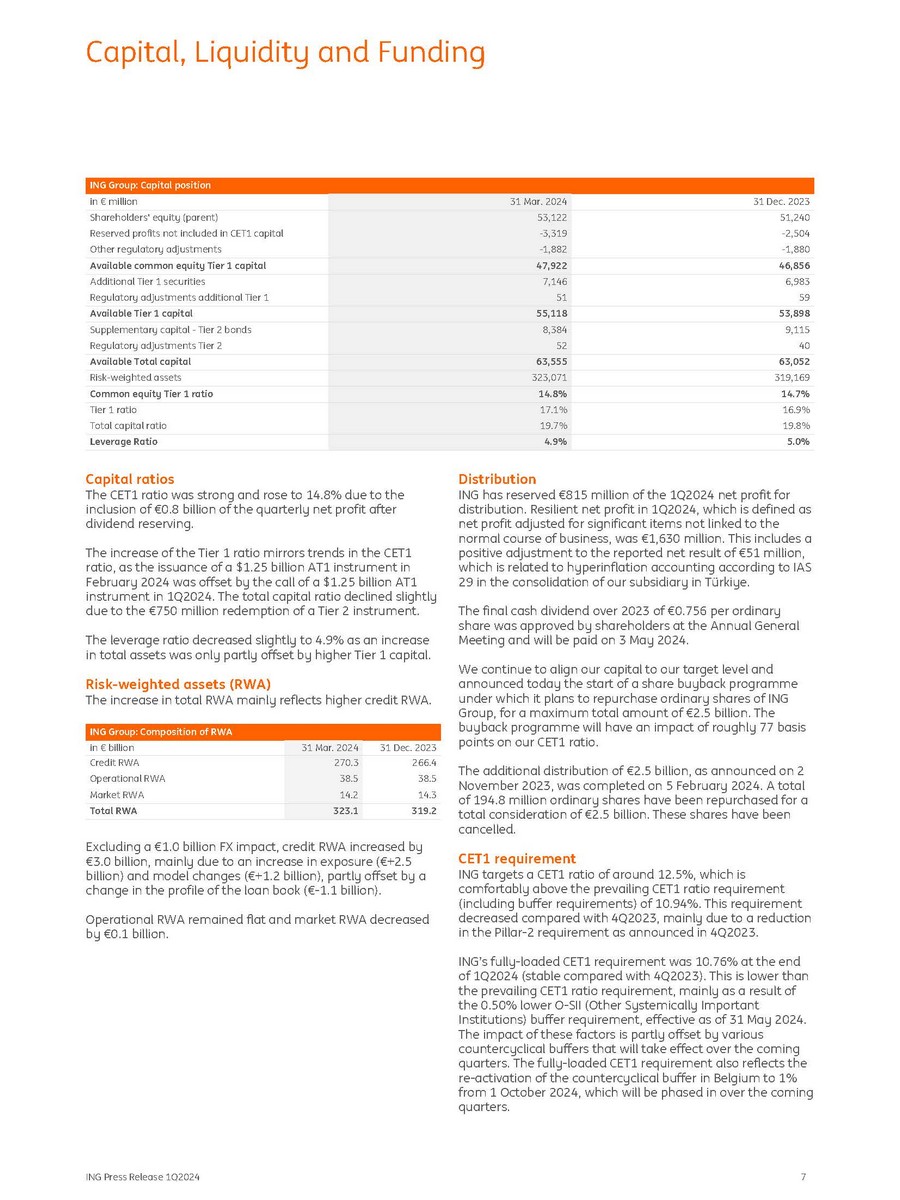 ING Group: Capital position 31 Dec. 2023 31 Mar. 2024 in € million 51,240 - 2,504 - 1,880 53,122 - 3,319 - 1,882 Shareholders' equity (parent) Reserved profits not included in CET1 capital Other regulatory adjustments 46,856 47,922 Available common equity Tier 1 capital 6,983 59 7,146 51 Additional Tier 1 securities Regulatory adjustments additional Tier 1 53,898 55,118 Available Tier 1 capital 9,115 8,384 Supplementary capital - Tier 2 bonds 40 52 Regulatory adjustments Tier 2 63,052 63,555 Available Total capital 319,169 323,071 Risk - weighted assets 14.7% 14.8% Common equity Tier 1 ratio 16.9% 17.1% Tier 1 ratio 19.8% 19.7% Total capital ratio 5.0% 4.9% Leverage Ratio Capital ratios The CET1 ratio was strong and rose to 14.8% due to the inclusion of €0.8 billion of the quarterly net profit after dividend reserving. The increase of the Tier 1 ratio mirrors trends in the CET1 ratio, as the issuance of a $1.25 billion AT1 instrument in February 2024 was offset by the call of a $1.25 billion AT1 instrument in 1Q2024. The total capital ratio declined slightly due to the €750 million redemption of a Tier 2 instrument. The leverage ratio decreased slightly to 4.9% as an increase in total assets was only partly offset by higher Tier 1 capital. Risk - weighted assets (RWA) The increase in total RWA mainly reflects higher credit RWA. ING Group: Composition of RWA ING Press Release 1Q2024 7 31 Dec. 2023 31 Mar. 2024 in € billion 266.4 270.3 Credit RWA 38.5 38.5 Operational RWA 14.3 14.2 Market RWA 319.2 323.1 Total RWA Excluding a €1.0 billion FX impact, credit RWA increased by €3.0 billion, mainly due to an increase in exposure (€+2.5 billion) and model changes (€+1.2 billion), partly offset by a change in the profile of the loan book (€ - 1.1 billion). Operational RWA remained flat and market RWA decreased by €0.1 billion. Distribution ING has reserved €815 million of the 1Q2024 net profit for distribution. Resilient net profit in 1Q2024, which is defined as net profit adjusted for significant items not linked to the normal course of business, was €1,630 million. This includes a positive adjustment to the reported net result of €51 million, which is related to hyperinflation accounting according to IAS 29 in the consolidation of our subsidiary in Türkiye. The final cash dividend over 2023 of €0.756 per ordinary share was approved by shareholders at the Annual General Meeting and will be paid on 3 May 2024. We continue to align our capital to our target level and announced today the start of a share buyback programme under which it plans to repurchase ordinary shares of ING Group, for a maximum total amount of €2.5 billion. The buyback programme will have an impact of roughly 77 basis points on our CET1 ratio. The additional distribution of €2.5 billion, as announced on 2 November 2023, was completed on 5 February 2024. A total of 194.8 million ordinary shares have been repurchased for a total consideration of €2.5 billion. These shares have been cancelled. CET1 requirement ING targets a CET1 ratio of around 12.5%, which is comfortably above the prevailing CET1 ratio requirement (including buffer requirements) of 10.94%. This requirement decreased compared with 4Q2023, mainly due to a reduction in the Pillar - 2 requirement as announced in 4Q2023. ING’s fully - loaded CET1 requirement was 10.76% at the end of 1Q2024 (stable compared with 4Q2023). This is lower than the prevailing CET1 ratio requirement, mainly as a result of the 0.50% lower O - SII (Other Systemically Important Institutions) buffer requirement, effective as of 31 May 2024. The impact of these factors is partly offset by various countercyclical buffers that will take effect over the coming quarters. The fully - loaded CET1 requirement also reflects the re - activation of the countercyclical buffer in Belgium to 1% from 1 October 2024, which will be phased in over the coming quarters. Capital, Liquidity and Funding