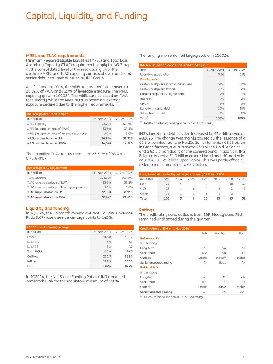 MREL and TLAC requirements Minimum Required Eligible Liabilities (MREL) and Total Loss Absorbing Capacity (TLAC) requirements apply to ING Group at the consolidated level of the resolution group. The available MREL and TLAC capacity consists of own funds and senior debt instruments issued by ING Group. As of 1 January 2024, the MREL requirements increased to 29.02% of RWA and 7.27% of leverage exposure. The MREL capacity grew in 1Q2024. The MREL surplus based on RWA rose slightly while the MREL surplus based on leverage exposure declined due to the higher requirements. ING Group: MREL requirement 31 Dec. 2023 31 Mar. 2024 in € million 103,602 108,704 MREL capacity 32.5% 33.6% MREL (as a percentage of RWA) 9.6% 9.6% MREL (as a percentage of leverage exposure) 39,318 26,154 MREL surplus based on LR 14,920 14,946 MREL surplus based on RWA The prevailing TLAC requirements are 23.51% of RWA and 6.75% of LR. ING Group: TLAC requirement 31 Dec. 2023 31 Mar. 2024 in € million 103,602 108,704 TLAC capacity 32.5% 33.6% TLAC (as a percentage of RWA) 9.6% 9.6% TLAC (as a percentage of leverage exposure) 30,919 32,058 TLAC surplus based on LR 28,613 32,747 TLAC surplus based on RWA Liquidity and funding In 1Q2024, the 12 - month moving average Liquidity Coverage Ratio (LCR) rose three percentage points to 146%. LCR 12 - month moving average 31 Dec. 2023 31 Mar. 2024 in € billion 186.7 186.8 Level 1 3.1 3.0 Level 2A 4.7 5.2 Level 2B 194.5 195.0 Total HQLA 238.4 235.3 Outflow 102.9 101.9 Inflow 143% 146% LCR In 1Q2024, the Net Stable Funding Ratio of ING remained comfortably above the regulatory minimum of 100%. The funding mix remained largely stable in 1Q2024. ING Group: Loan - to - deposit ratio and funding mix 31 Dec. 2023 31 Mar. 2024 In % 0.99 0.96 Loan - to - deposit ratio Funding mix 52% 51% Customer deposits (private individuals) 22% 22% Customer deposits (other) 7% 7% Lending / repurchase agreements 2% 2% Interbank 5% 6% CD/CP 10% 10% Long - term senior debt 2% 2% Subordinated debt 100% 100% Total 1) 1) Liabilities excluding trading securities and IFRS equity. ING’s long - term debt position increased by €8.4 billion versus 4Q2023. The change was mainly caused by the issuance of a €2.5 billion dual tranche HoldCo Senior (of which €1.25 billion in Green format), a dual tranche $3.0 billion HoldCo Senior and a €2.5 billion dual tranche covered bond. In addition, ING Belgium issued a €1.0 billion covered bond and ING Australia issued AUD 1.25 billion Opco Senior. This was partly offset by redemptions amounting to €2.7 billion. Long - term debt maturity ladder per currency, 31 March 2024 >2028 2028 2027 2026 2025 2024 Total in € billion 39 10 7 9 7 1 73 EUR 9 3 5 4 0 1 22 USD 4 2 1 3 1 1 11 Other 52 15 13 16 8 3 106 Total Ratings The credit ratings and outlooks from S&P, Moody’s and Fitch remained unchanged during the quarter. Credit ratings of ING on 1 May 2024 S&P Moody's Fitch ING Groep N.V. Issuer rating Long - term Short - term Outlook Senior unsecured rating A - A - 2 Stable A - n/a n/a Stable 1) Baa1 A+ F1 Stable A+ ING Bank N.V. Issuer rating Long - term Short - term Outlook Senior unsecured rating A+ A - 1 Stable A+ A1 P - 1 Stable A1 AA - F1+ Stable AA - 1) Outlook refers to the senior unsecured rating. Capital, Liquidity and Funding ING Press Release 1Q2024 8