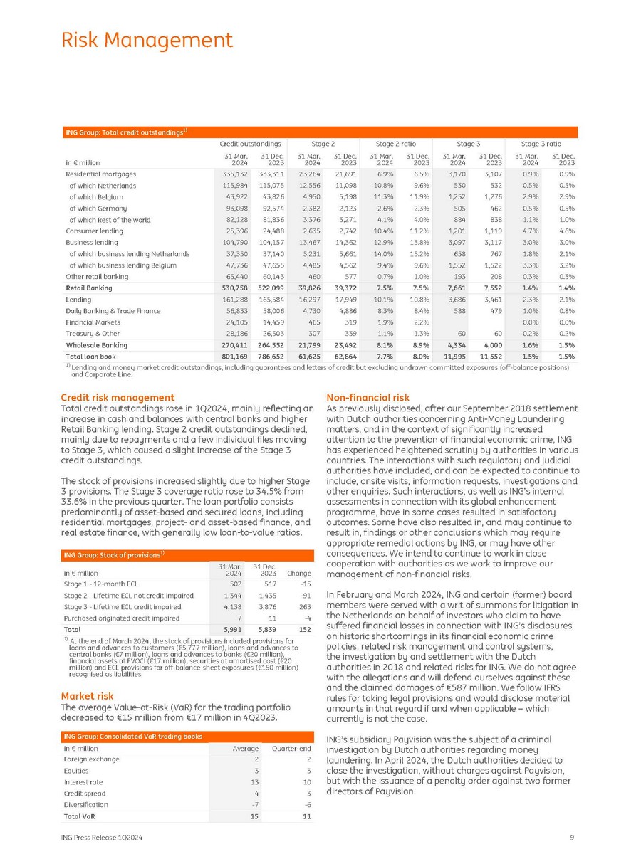 ING Press Release 1Q2024 9 ING Group: Total credit outstandings 1) Stage 3 ratio 31 Mar. 31 Dec. 2024 2023 Stage 3 31 Mar. 31 Dec. 2024 2023 Stage 2 ratio 31 Mar. 31 Dec. 2024 2023 Stage 2 31 Mar. 31 Dec. 2024 2023 Credit outstandings 31 Mar. 31 Dec. 2024 2023 in € million 0.9% 0.9% 3,107 3,170 6.5% 6.9% 21,691 23,264 333,311 335,132 Residential mortgages 0.5% 0.5% 532 530 9.6% 10.8% 11,098 12,556 115,075 115,984 of which Netherlands 2.9% 2.9% 1,276 1,252 11.9% 11.3% 5,198 4,950 43,826 43,922 of which Belgium 0.5% 0.5% 462 505 2.3% 2.6% 2,123 2,382 92,574 93,098 of which Germany 1.0% 1.1% 838 884 4.0% 4.1% 3,271 3,376 81,836 82,128 of which Rest of the world 4.6% 4.7% 1,119 1,201 11.2% 10.4% 2,742 2,635 24,488 25,396 Consumer lending 3.0% 3.0% 3,117 3,097 13.8% 12.9% 14,362 13,467 104,157 104,790 Business lending 2.1% 1.8% 767 658 15.2% 14.0% 5,661 5,231 37,140 37,350 of which business lending Netherlands 3.2% 3.3% 1,522 1,552 9.6% 9.4% 4,562 4,485 47,655 47,736 of which business lending Belgium 0.3% 0.3% 208 193 1.0% 0.7% 577 460 60,143 65,440 Other retail banking 1.4% 1.4% 7,552 7,661 7.5% 7.5% 39,372 39,826 522,099 530,758 Retail Banking 2.1% 0.8% 0.0% 0.2% 2.3% 1.0% 0.0% 0.2% 3,461 479 60 3,686 588 60 10.8% 8.4% 2.2% 1.3% 10.1% 8.3% 1.9% 1.1% 17,949 4,886 319 339 16,297 4,730 465 307 165,584 58,006 14,459 26,503 161,288 56,833 24,105 28,186 Lending Daily Banking & Trade Finance Financial Markets Treasury & Other 1.5% 1.6% 4,000 4,334 8.9% 8.1% 23,492 21,799 264,552 270,411 Wholesale Banking 1.5% 1.5% 11,552 11,995 8.0% 7.7% 62,864 61,625 786,652 801,169 Total loan book 1) Lending and money market credit outstandings, including guarantees and letters of credit but excluding undrawn committed exposures (off - balance positions) and Corporate Line. Credit risk management Total credit outstandings rose in 1Q2024, mainly reflecting an increase in cash and balances with central banks and higher Retail Banking lending. Stage 2 credit outstandings declined, mainly due to repayments and a few individual files moving to Stage 3, which caused a slight increase of the Stage 3 credit outstandings. The stock of provisions increased slightly due to higher Stage 3 provisions. The Stage 3 coverage ratio rose to 34.5% from 33.6% in the previous quarter. The loan portfolio consists predominantly of asset - based and secured loans, including residential mortgages, project - and asset - based finance, and real estate finance, with generally low loan - to - value ratios. ING Group: Stock of provisions 1) Change 31 Dec. 2023 31 Mar. 2024 in € million - 15 517 502 Stage 1 - 12 - month ECL - 91 1,435 1,344 Stage 2 - Lifetime ECL not credit impaired 263 3,876 4,138 Stage 3 - Lifetime ECL credit impaired - 4 11 7 Purchased originated credit impaired 152 5,839 5,991 Total 1) At the end of March 2024, the stock of provisions included provisions for loans and advances to customers (€5,777 million), loans and advances to central banks (€7 million), loans and advances to banks (€20 million), financial assets at FVOCI (€17 million), securities at amortised cost (€20 million) and ECL provisions for off - balance - sheet exposures (€150 million) recognised as liabilities. Market risk The average Value - at - Risk (VaR) for the trading portfolio decreased to €15 million from €17 million in 4Q2023. ING Group: Consolidated VaR trading books Quarter - end Average in € million 2 2 Foreign exchange 3 3 Equities 10 13 Interest rate 3 4 Credit spread - 6 - 7 Diversification 11 15 Total VaR Non - financial risk As previously disclosed, after our September 2018 settlement with Dutch authorities concerning Anti - Money Laundering matters, and in the context of significantly increased attention to the prevention of financial economic crime, ING has experienced heightened scrutiny by authorities in various countries. The interactions with such regulatory and judicial authorities have included, and can be expected to continue to include, onsite visits, information requests, investigations and other enquiries. Such interactions, as well as ING’s internal assessments in connection with its global enhancement programme, have in some cases resulted in satisfactory outcomes. Some have also resulted in, and may continue to result in, findings or other conclusions which may require appropriate remedial actions by ING, or may have other consequences. We intend to continue to work in close cooperation with authorities as we work to improve our management of non - financial risks. In February and March 2024, ING and certain (former) board members were served with a writ of summons for litigation in the Netherlands on behalf of investors who claim to have suffered financial losses in connection with ING’s disclosures on historic shortcomings in its financial economic crime policies, related risk management and control systems, the investigation by and settlement with the Dutch authorities in 2018 and related risks for ING. We do not agree with the allegations and will defend ourselves against these and the claimed damages of €587 million. We follow IFRS rules for taking legal provisions and would disclose material amounts in that regard if and when applicable – which currently is not the case. ING’s subsidiary Payvision was the subject of a criminal investigation by Dutch authorities regarding money laundering. In April 2024, the Dutch authorities decided to close the investigation, without charges against Payvision, but with the issuance of a penalty order against two former directors of Payvision. Risk Management