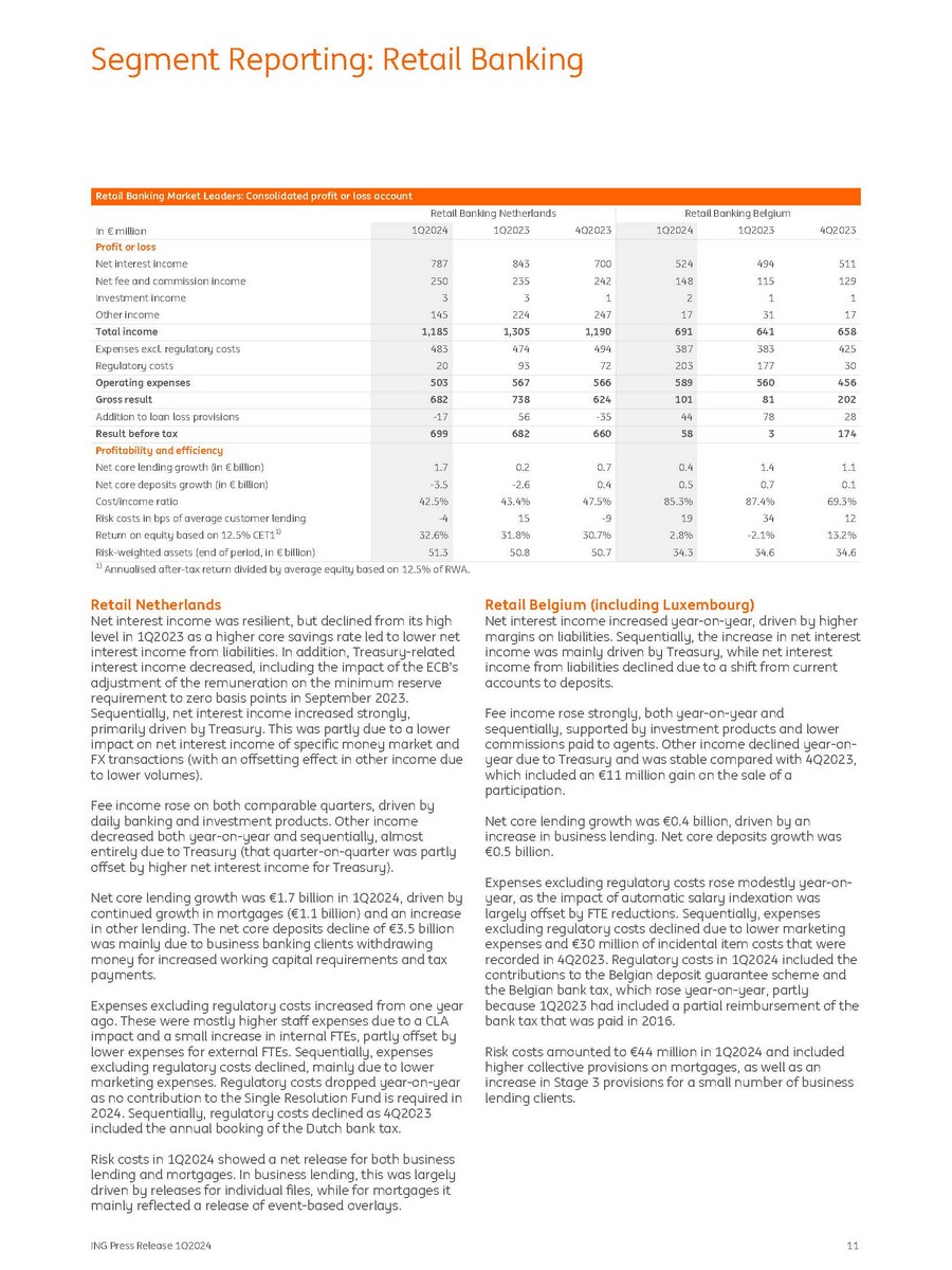 Retail Banking: Consolidated profit or loss account ING Press Release 1Q2024 10 Change 4Q2023 Change 1Q2023 1Q2024 In € million Profit or loss 4.9% 2,795 4.1% 2,817 2,933 Net interest income 10.2% 586 12.3% 575 646 Net fee and commission income - 19 - 58.3% 12 5 Investment income - 48.2% 332 - 44.2% 308 172 Other income 1.7% 3,693 1.2% 3,712 3,757 Total income - 4.7% 1,836 2.8% 1,703 1,750 Expenses excl. regulatory costs 55.1% 207 - 17.5% 389 321 Regulatory costs 1.4% 2,043 - 1.0% 2,092 2,072 Operating expenses 2.1% 1,650 4.0% 1,620 1,685 Gross result 91.9% 86 - 31.8% 242 165 Addition to loan loss provisions - 2.9% 1,565 10.2% 1,379 1,520 Result before tax Profitability and efficiency 3.8 2.2 3.7 Net core lending growth (in € billion) 2.5 1.7 9.2 Net core deposits growth (in € billion) 55.3% 56.4% 55.1% Cost/income ratio 8 21 14 Risk costs in bps of average customer lending 23.2% 19.2% 22.6% Return on equity based on 12.5% CET1 1) 1.3% 154.4 0.5% 155.6 156.4 Risk - weighted assets (end of period, in € billion) 1) Annualised after - tax return divided by average equity based on 12.5% of RWA. Retail Banking Retail Banking maintained strong commercial momentum in 1Q2024. The primary customer base increased by 99,000 customers, and both customer lending and customer deposits grew too. These factors contributed to the strong 1Q2024 financial results and a return on equity of 22.6%. Retail Banking’s result before tax increased 10% year - on - year, supported by higher income and lower operating expenses and risk costs. Quarter - on - quarter, the result before tax declined slightly as risk costs rose from the low level recorded in 4Q2023. Total income increased on both comparable quarters, driven by higher net interest income and double - digit growth in fee income. The increase in total income was only partly offset by lower other income for Treasury. Net interest income rose 4.1% year - on - year, mainly reflecting higher net interest income on liabilities following a rapid increase in the short - term interest rates in 2023. Sequentially, net interest income was up 4.9%. This was largely attributable to Treasury (with an offset in other income) and furthermore supported by higher average lending and deposit volumes. Fee income grew 12% compared with 1Q2023 and 10% sequentially. The increases were primarily driven by higher fee income for both daily banking and investment products. We benefited from the fact that more customers chose ING for their banking products coupled with increased package fees, as well as from growth in assets under management and in the number of brokerage trades. Net core lending growth, which excludes currency impacts, Treasury and the run - off in Westland Utrecht Bank, was €3.7 billion. The bulk of this growth was in residential mortgages, with an increase recorded across all of our markets. Net core deposits growth, excluding FX impacts and Treasury, was €9.2 billion and primarily driven by Germany and Poland. Expenses excluding regulatory costs increased 2.8% year - on - year, as the impact of inflation on staff expenses was partly offset by lower provisions for legal claims and restructuring. Sequentially, after adjusting for the €85 million of incidental item costs recorded in 4Q2023, expenses excluding regulatory costs were relatively stable. Regulatory costs are normally seasonally higher in the first quarter, but they declined year - on - year because no contribution is required to the eurozone's Single Resolution Fund in 2024. The cost/ income ratio improved to 55.1% in 1Q2024 compared with 56.4% in 1Q2023. Risk costs in 1Q2024 were 14 basis points of average customer lending, which is well below the through - the - cycle average and reflects our strong asset quality. Segment Reporting: Retail Banking