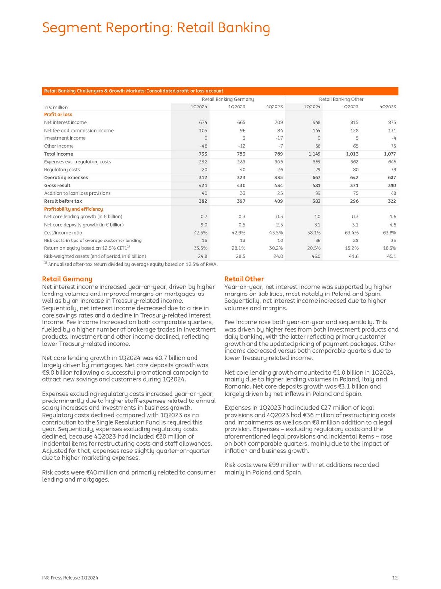 Retail Banking Other Retail Banking Challengers & Growth Markets: Consolidated profit or loss account Retail Banking Germany 4Q2023 1Q2023 1Q2024 4Q2023 1Q2023 1Q2024 In € million Profit or loss 875 815 948 709 665 674 Net interest income 131 128 144 84 96 105 Net fee and commission income - 4 5 0 - 17 3 0 Investment income 75 65 56 - 7 - 12 - 46 Other income 1,077 1,013 1,149 769 753 733 Total income 608 562 589 309 283 292 Expenses excl. regulatory costs 79 80 79 26 40 20 Regulatory costs 687 642 667 335 323 312 Operating expenses 390 371 481 434 430 421 Gross result 68 75 99 25 33 40 Addition to loan loss provisions 322 296 383 409 397 382 Result before tax Profitability and efficiency 1.6 0.3 1.0 0.3 0.3 0.7 Net core lending growth (in € billion) 4.6 3.1 3.1 - 2.5 0.5 9.0 Net core deposits growth (in € billion) 63.8% 63.4% 58.1% 43.5% 42.9% 42.5% Cost/income ratio 25 28 36 10 13 15 Risk costs in bps of average customer lending 18.3% 15.2% 20.5% 30.2% 28.1% 33.5% Return on equity based on 12.5% CET1 1) 45.1 41.6 46.0 24.0 28.5 24.8 Risk - weighted assets (end of period, in € billion) ING Press Release 1Q2024 12 1) Annualised after - tax return divided by average equity based on 12.5% of RWA. Retail Germany Net interest income increased year - on - year, driven by higher lending volumes and improved margins on mortgages, as well as by an increase in Treasury - related income. Sequentially, net interest income decreased due to a rise in core savings rates and a decline in Treasury - related interest income. Fee income increased on both comparable quarters, fuelled by a higher number of brokerage trades in investment products. Investment and other income declined, reflecting lower Treasury - related income. Net core lending growth in 1Q2024 was €0.7 billion and largely driven by mortgages. Net core deposits growth was €9.0 billion following a successful promotional campaign to attract new savings and customers during 1Q2024. Expenses excluding regulatory costs increased year - on - year, predominantly due to higher staff expenses related to annual salary increases and investments in business growth. Regulatory costs declined compared with 1Q2023 as no contribution to the Single Resolution Fund is required this year. Sequentially, expenses excluding regulatory costs declined, because 4Q2023 had included €20 million of incidental items for restructuring costs and staff allowances. Adjusted for that, expenses rose slightly quarter - on - quarter due to higher marketing expenses. Risk costs were €40 million and primarily related to consumer lending and mortgages. Retail Other Year - on - year, net interest income was supported by higher margins on liabilities, most notably in Poland and Spain. Sequentially, net interest income increased due to higher volumes and margins. Fee income rose both year - on - year and sequentially. This was driven by higher fees from both investment products and daily banking, with the latter reflecting primary customer growth and the updated pricing of payment packages. Other income decreased versus both comparable quarters due to lower Treasury - related income. Net core lending growth amounted to €1.0 billion in 1Q2024, mainly due to higher lending volumes in Poland, Italy and Romania. Net core deposits growth was €3.1 billion and largely driven by net inflows in Poland and Spain. Expenses in 1Q2023 had included €27 million of legal provisions and 4Q2023 had €36 million of restructuring costs and impairments as well as an €8 million addition to a legal provision. Expenses – excluding regulatory costs and the aforementioned legal provisions and incidental items – rose on both comparable quarters, mainly due to the impact of inflation and business growth. Risk costs were €99 million with net additions recorded mainly in Poland and Spain. Segment Reporting: Retail Banking