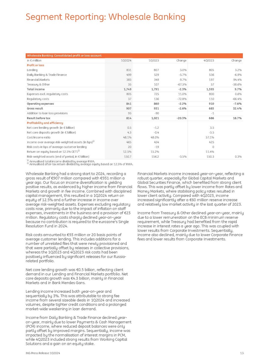 Wholesale Banking: Consolidated profit or loss account ING Press Release 1Q2024 13 Change 4Q2023 Change 1Q2023 1Q2024 In € million Profit or loss 3.2% 805 3.0% 807 831 Lending - 6.9% 536 - 5.7% 529 499 Daily Banking & Trade Finance 94.4% 197 9.7% 349 383 Financial Markets - 38.6% 57 - 67.3% 107 35 Treasury & Other 9.7% 1,595 - 2.3% 1,791 1,749 Total income 0.6% 800 11.0% 725 805 Expenses excl. regulatory costs - 66.4% 110 - 72.8% 136 37 Regulatory costs - 7.6% 910 - 2.2% 860 841 Operating expenses 32.4% 685 - 2.6% 931 907 Gross result - 1 - 90 93 Addition to loan loss provisions 18.7% 686 - 20.3% 1,021 814 Result before tax Profitability and efficiency 3.5 - 1.2 0.5 Net core lending growth (in € billion) - 3.5 - 0.4 4.3 Net core deposits growth (in € billion) 57.1% 48.0% 48.1% Cost/income ratio 425 454 465 Income over average risk - weighted assets (in bps) 1) 0 - 19 20 Risk costs in bps of average customer lending 11.4% 15.2% 12.5% Return on equity based on 12.5% CET1 2) 0.3% 150.3 - 3.5% 156.2 150.7 Risk - weighted assets (end of period, in € billion) 1) Annualised total income divided by average RWA. 2) Annualised after - tax return divided by average equity based on 12.5% of RWA. Wholesale Banking had a strong start to 2024, recording a gross result of €907 million compared with €931 million a year ago. Our focus on income diversification is yielding positive results, as evidenced by higher income from Financial Markets and growth in fee income. Combined with disciplined capital management, this resulted in a 1Q2024 return on equity of 12.5% and a further increase in income over average risk - weighted assets. Expenses excluding regulatory costs rose, primarily due to the impact of inflation on staff expenses, investments in the business and a provision of €23 million. Regulatory costs sharply declined year - on - year because no contribution is required to the eurozone's Single Resolution Fund in 2024. Risk costs amounted to €93 million or 20 basis points of average customer lending. This includes additions for a number of unrelated files that were newly provisioned and that were partially offset by releases in collective provisions, whereas the 1Q2023 and 4Q2023 risk costs had been positively influenced by significant releases for our Russia - related portfolio. Net core lending growth was €0.5 billion, reflecting client demand in our Lending and Financial Markets portfolio. Net core deposits growth was €4.3 billion, mainly in Financial Markets and in Bank Mendes Gans. Lending income increased both year - on - year and sequentially by 3%. This was attributable to strong fee income from several sizeable deals in 1Q2024 and increased volumes, despite tighter credit conditions and a prolonged market - wide weakening in loan demand. Income from Daily Banking & Trade Finance declined year - on - year, mainly due to lower Payments & Cash Management (PCM) income, where reduced deposit balances were only partly offset by improved margins. Sequentially, income was impacted by the normalisation of interest margins in PCM, while 4Q2023 included strong results from Working Capital Solutions and a gain on an equity stake. Financial Markets income increased year - on - year, reflecting a robust quarter, especially for Global Capital Markets and Global Securities Finance, which benefited from strong client flows. This was partly offset by lower income from Rates and Money Markets, where stabilising policy rates resulted in lower client activity. Compared with 4Q2023, income increased significantly after a €60 million reserve increase and relatively low market activity in the last quarter of 2023. Income from Treasury & Other declined year - on - year, mainly due to a lower remuneration on the ECB minimum reserve requirement, while Treasury had benefited from the rapid increase in interest rates a year ago. This was coupled with lower results from Corporate Investments. Sequentially, income also declined, mainly due to lower Corporate Finance fees and lower results from Corporate Investments. Segment Reporting: Wholesale Banking