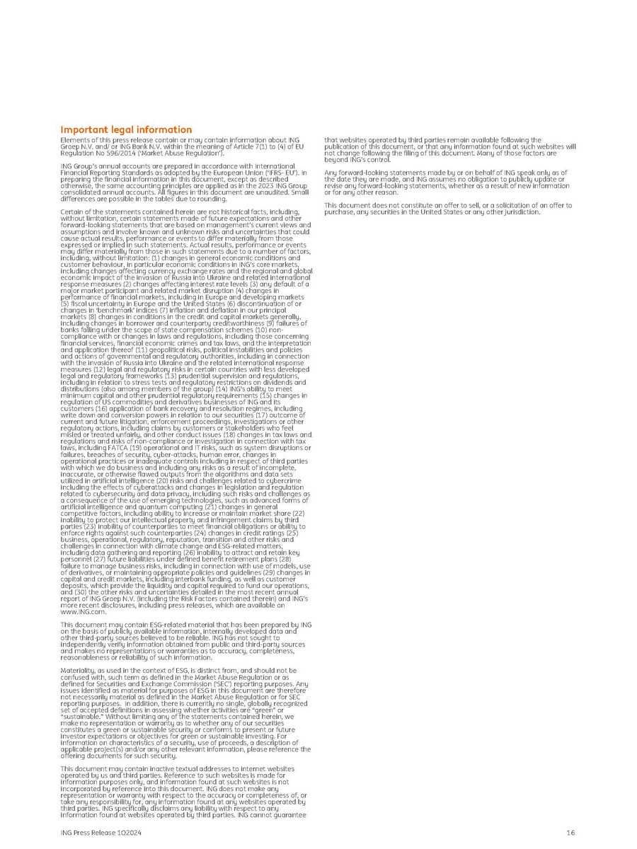 ING Press Release 1Q2024 16 Important legal information Elements of this press release contain or may contain information about ING Groep N.V. and/ or ING Bank N.V. within the meaning of Article 7(1) to (4) of EU Regulation No 596/2014 (‘Market Abuse Regulation’). ING Group’s annual accounts are prepared in accordance with International Financial Reporting Standards as adopted by the European Union (‘IFRS - EU’). In preparing the financial information in this document, except as described otherwise, the same accounting principles are applied as in the 2023 ING Group consolidated annual accounts. All figures in this document are unaudited. Small differences are possible in the tables due to rounding. Certain of the statements contained herein are not historical facts, including, without limitation, certain statements made of future expectations and other forward - looking statements that are based on management’s current views and assumptions and involve known and unknown risks and uncertainties that could cause actual results, performance or events to differ materially from those expressed or implied in such statements. Actual results, performance or events may differ materially from those in such statements due to a number of factors, including, without limitation: (1) changes in general economic conditions and customer behaviour, in particular economic conditions in ING’s core markets, including changes affecting currency exchange rates and the regional and global economic impact of the invasion of Russia into Ukraine and related international response measures (2) changes affecting interest rate levels (3) any default of a major market participant and related market disruption (4) changes in performance of financial markets, including in Europe and developing markets (5) fiscal uncertainty in Europe and the United States (6) discontinuation of or changes in ‘benchmark’ indices (7) inflation and deflation in our principal markets (8) changes in conditions in the credit and capital markets generally, including changes in borrower and counterparty creditworthiness (9) failures of banks falling under the scope of state compensation schemes (10) non - compliance with or changes in laws and regulations, including those concerning financial services, financial economic crimes and tax laws, and the interpretation and application thereof (11) geopolitical risks, political instabilities and policies and actions of governmental and regulatory authorities, including in connection with the invasion of Russia into Ukraine and the related international response measures (12) legal and regulatory risks in certain countries with less developed legal and regulatory frameworks (13) prudential supervision and regulations, including in relation to stress tests and regulatory restrictions on dividends and distributions (also among members of the group) (14) ING’s ability to meet minimum capital and other prudential regulatory requirements (15) changes in regulation of US commodities and derivatives businesses of ING and its customers (16) application of bank recovery and resolution regimes, including write down and conversion powers in relation to our securities (17) outcome of current and future litigation, enforcement proceedings, investigations or other regulatory actions, including claims by customers or stakeholders who feel misled or treated unfairly, and other conduct issues (18) changes in tax laws and regulations and risks of non - compliance or investigation in connection with tax laws, including FATCA (19) operational and IT risks, such as system disruptions or failures, breaches of security, cyber - attacks, human error, changes in operational practices or inadequate controls including in respect of third parties with which we do business and including any risks as a result of incomplete, inaccurate, or otherwise flawed outputs from the algorithms and data sets utilized in artificial intelligence (20) risks and challenges related to cybercrime including the effects of cyberattacks and changes in legislation and regulation related to cybersecurity and data privacy, including such risks and challenges as a consequence of the use of emerging technologies, such as advanced forms of artificial intelligence and quantum computing (21) changes in general competitive factors, including ability to increase or maintain market share (22) inability to protect our intellectual property and infringement claims by third parties (23) inability of counterparties to meet financial obligations or ability to enforce rights against such counterparties (24) changes in credit ratings (25) business, operational, regulatory, reputation, transition and other risks and challenges in connection with climate change and ESG - related matters, including data gathering and reporting (26) inability to attract and retain key personnel (27) future liabilities under defined benefit retirement plans (28) failure to manage business risks, including in connection with use of models, use of derivatives, or maintaining appropriate policies and guidelines (29) changes in capital and credit markets, including interbank funding, as well as customer deposits, which provide the liquidity and capital required to fund our operations, and (30) the other risks and uncertainties detailed in the most recent annual report of ING Groep N.V. (including the Risk Factors contained therein) and ING’s more recent disclosures, including press releases, which are available on www.ING.com. This document may contain ESG - related material that has been prepared by ING on the basis of publicly available information, internally developed data and other third - party sources believed to be reliable. ING has not sought to independently verify information obtained from public and third - party sources and makes no representations or warranties as to accuracy, completeness, reasonableness or reliability of such information. Materiality, as u
