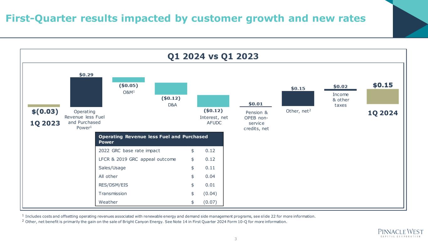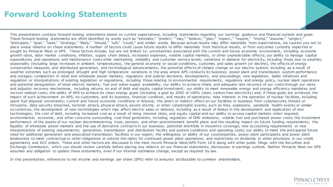 2 This presentation contains forward-looking statements based on current expectations, including statements regarding our earnings guidance and financial outlook and goals. These forward- looking statements are often identified by words such as “estimate,” “predict,” “may,” “believe,” “plan,” “expect,” “require,” “intend,” “assume,” “project,” "anticipate," "goal," "seek," "strategy," "likely," "should," "will," "could," and similar words. Because actual results may differ materially from expectations, we caution you not to place undue reliance on these statements. A number of factors could cause future results to differ materially from historical results, or from outcomes currently expected or sought by Pinnacle West or APS. These factors include, but are not limited to: uncertainties associated with the current and future economic environment, including economic growth rates, labor market conditions, inflation, supply chain delays, increased expenses, volatile capital markets, or other unpredictable effects; our ability to manage capital expenditures and operations and maintenance costs while maintaining reliability and customer service levels; variations in demand for electricity, including those due to weather, seasonality (including large increases in ambient temperatures), the general economy or social conditions, customer, and sales growth (or decline), the effects of energy conservation measures and distributed generation, and technological advancements; the potential effects of climate change on our electric system, including as a result of weather extremes such as prolonged drought and high temperature variations in the area where APS conducts its business; power plant and transmission system performance and outages; competition in retail and wholesale power markets; regulatory and judicial decisions, developments, and proceedings; new legislation, ballot initiatives and regulation or interpretations of existing legislation or regulations, including those relating to environmental requirements, regulatory and energy policy, nuclear plant operations and potential deregulation of retail electric markets; fuel and water supply availability; our ability to achieve timely and adequate rate recovery of our costs through our rates and adjustor recovery mechanisms, including returns on and of debt and equity capital investment; our ability to meet renewable energy and energy efficiency mandates and recover related costs; the ability of APS to achieve its clean energy goals (including a goal by 2050 of 100% clean, carbon-free electricity) and, if these goals are achieved, the impact of such achievement on APS, its customers, and its business, financial condition, and results of operations; risks inherent in the operation of nuclear facilities, including spent fuel disposal uncertainty; current and future economic conditions in Arizona; the direct or indirect effect on our facilities or business from cybersecurity threats or intrusions, data security breaches, terrorist attack, physical attack, severe storms, or other catastrophic events, such as fires, explosions, pandemic health events or similar occurrences; the development of new technologies which may affect electric sales or delivery, including as a result of delays in the development and application of new technologies; the cost of debt, including increased cost as a result of rising interest rates, and equity capital and our ability to access capital markets when required; environmental, economic, and other concerns surrounding coal-fired generation, including regulation of GHG emissions; volatile fuel and purchased power costs; the investment performance of the assets of our nuclear decommissioning trust, pension, and other postretirement benefit plans and the resulting impact on future funding requirements; the liquidity of wholesale power markets and the use of derivative contracts in our business; potential shortfalls in insurance coverage; new accounting requirements or new interpretations of existing requirements; generation, transmission and distribution facility and system conditions and operating costs; our ability to meet the anticipated future need for additional generation and associated transmission facilities in our region; the willingness or ability of our counterparties, power plant participants and power plant landowners to meet contractual or other obligations or extend the rights for continued power plant operations; and restrictions on dividends or other provisions in our credit agreements and ACC orders. These and other factors are discussed in the most recent Pinnacle West/APS Form 10-K along with other public filings with the Securities and Exchange Commission, which you should review carefully before placing any reliance on our financial statements, disclosures or earnings outlook. Neither Pinnacle West nor APS assumes any obligation to update these statements, even if our internal estimates change, except as required by law. In this presentation, references to net income and earnings per share (EPS) refer to amounts attributable to common shareholders. Forward Looking Statements