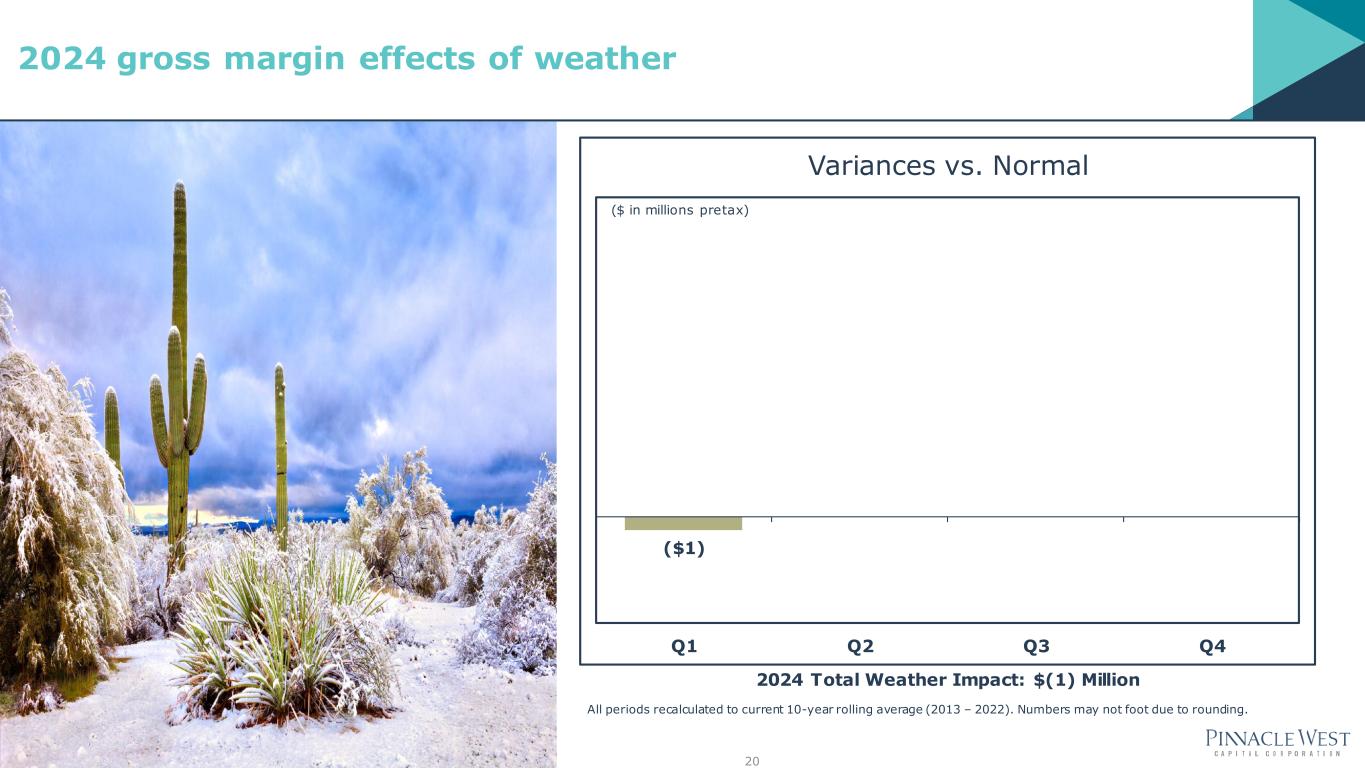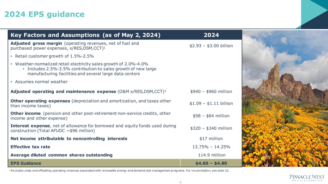 For 2024, the company continues to estimate its consolidated earnings guidance will be in the range of $4.60 to $4.80 per diluted share on a weather-normalized basis. Key factors and assumptions underlying this outlook can be found in the first-quarter 2024 earnings presentation slides at pinnaclewest.com/investors.