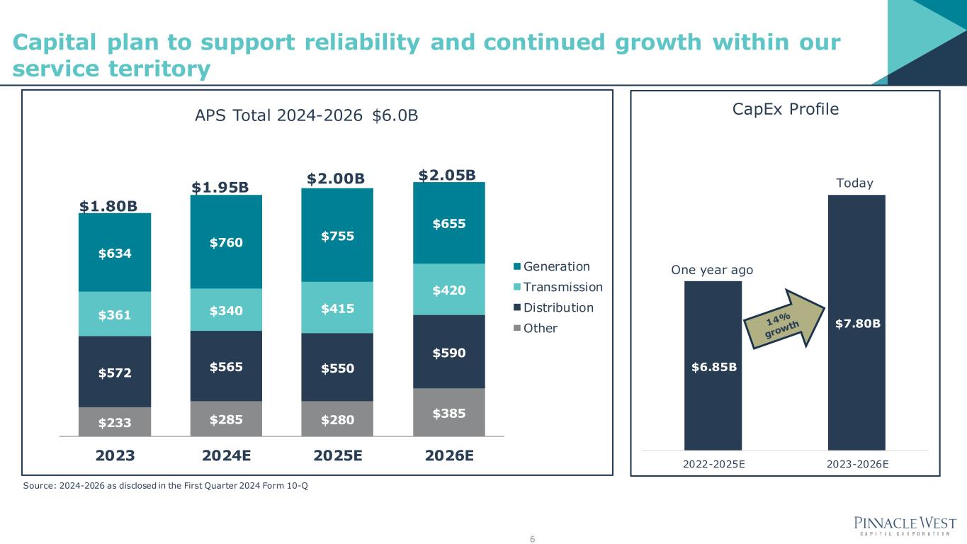 2024 EPS guidance of $4.60-$4.80 key drivers1 New rates in effect March 8, 2024 Depreciation, amortization and property taxes due to higher plant in service Retail customer growth of 1.5%-2.5% 2024 normal weather Weather-normalized retail electricity sales growth of 2.0%-4.0% (includes 2.5%- 3.5% from large C&I) Financing costs LFCR & 2019 GRC appeal outcome Operations and maintenance BCE sale Long-term guidance and key drivers • Long-term EPS growth target of 5%-7% off 2024 midpoint • Retail customer growth of 1.5%-2.5% • Weather-normalized retail electricity sales growth of 4%-6% (includes 3%-5% from large C&I customers) 0.8% 4.2% 2.4% 1.5% 2.0%-4.0% 0% 1% 2% 3% 4% 5% 6% '20 '21 '22 '23 '24E Total Sales Growth 5 1 Arrows represent expected comparative year-over-year impact of each driver on earnings. Key drivers for 2024 EPS guidance