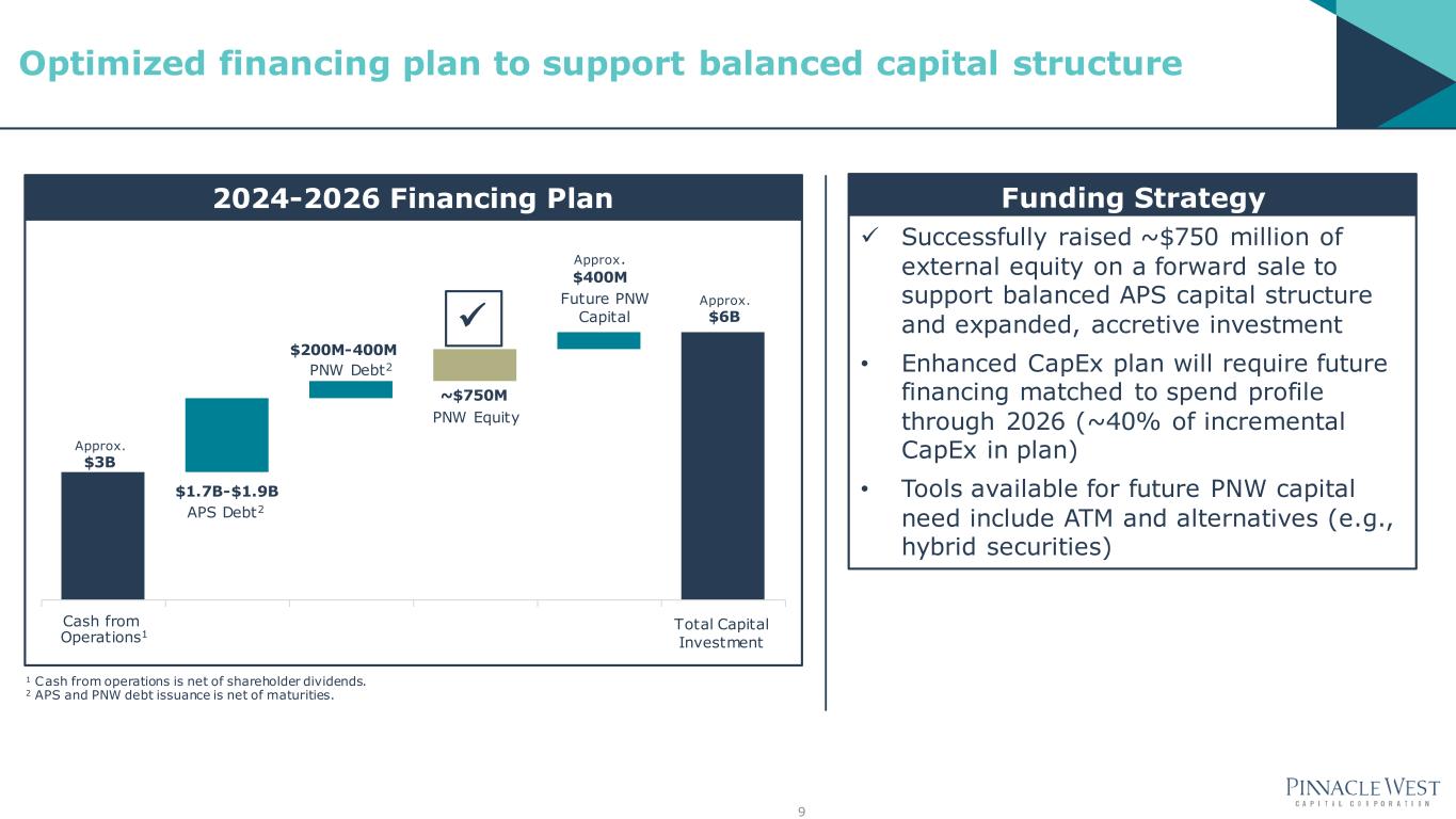 $886 $865-$875 $127 $125-$135 $46 $75-$85 2023 2024 O&M Guidance (millions) Planned Outages RES/DSM Core O&M 8 Operations & Maintenance Guidance • Reduced year-over-year core O&M excluding planned outages • Final planned major outage in Q4 2024 at Four Corners Unit 5 • Unit 4 final planned major outage in 2025 • Lean culture and declining O&M per MWh goal We are focused on cost control and customer affordability