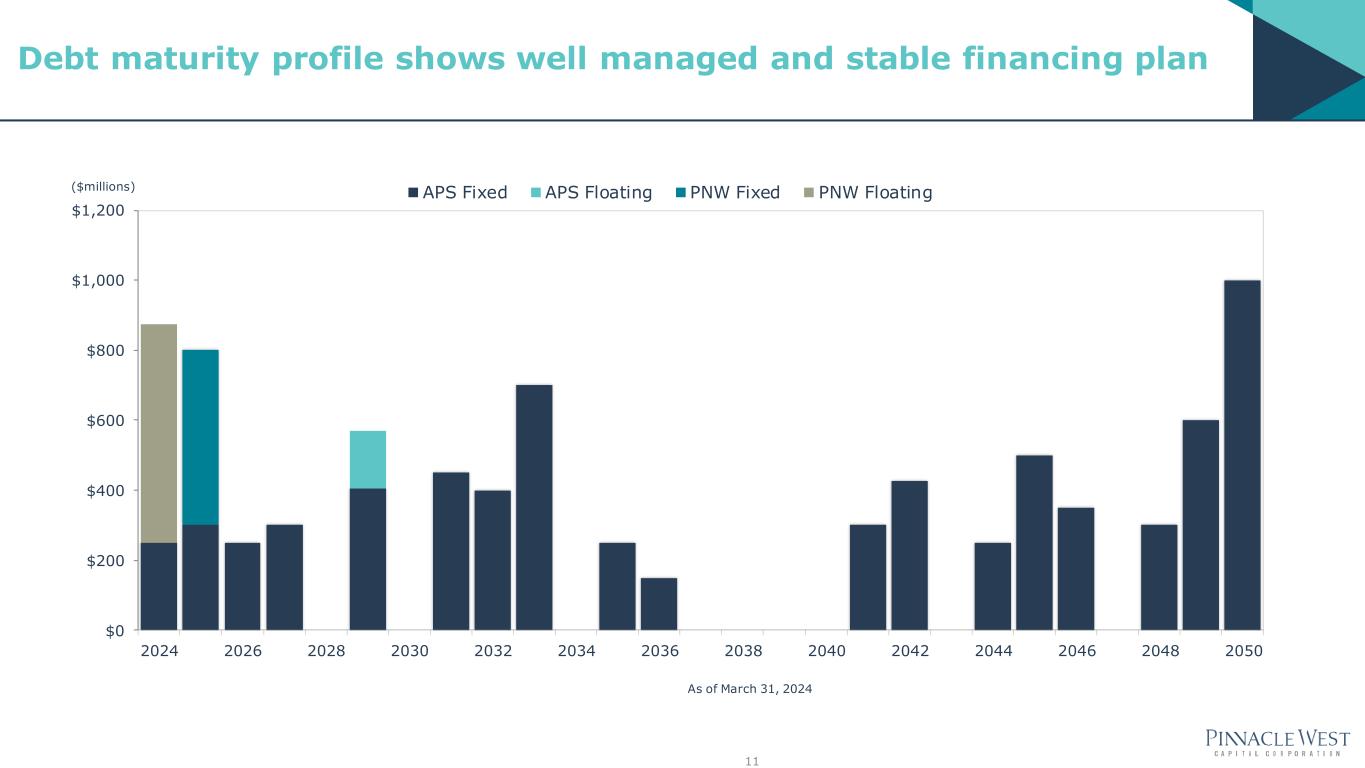 Balance Sheet Targets • Solid investment-grade credit ratings • APS equity layer >50% • PNW FFO/Debt range of 14%-16% Corporate Ratings Senior Unsecured Ratings Short-Term Ratings Outlook APS Moody’s Baa1 Baa1 P-2 Stable S&P BBB+ BBB+ A-2 Stable Fitch BBB+ A- F2 Stable Pinnacle West Moody’s Baa2 Baa2 P-2 Stable S&P BBB+ BBB A-2 Stable Fitch BBB BBB F3 Stable 10 1 We are disclosing credit ratings to enhance understanding of our sources of liquidity and the effects of our ratings on our costs of funds. Ratings are as of April 25, 2024. We are focused on maintaining healthy credit ratings to support affordable growth1