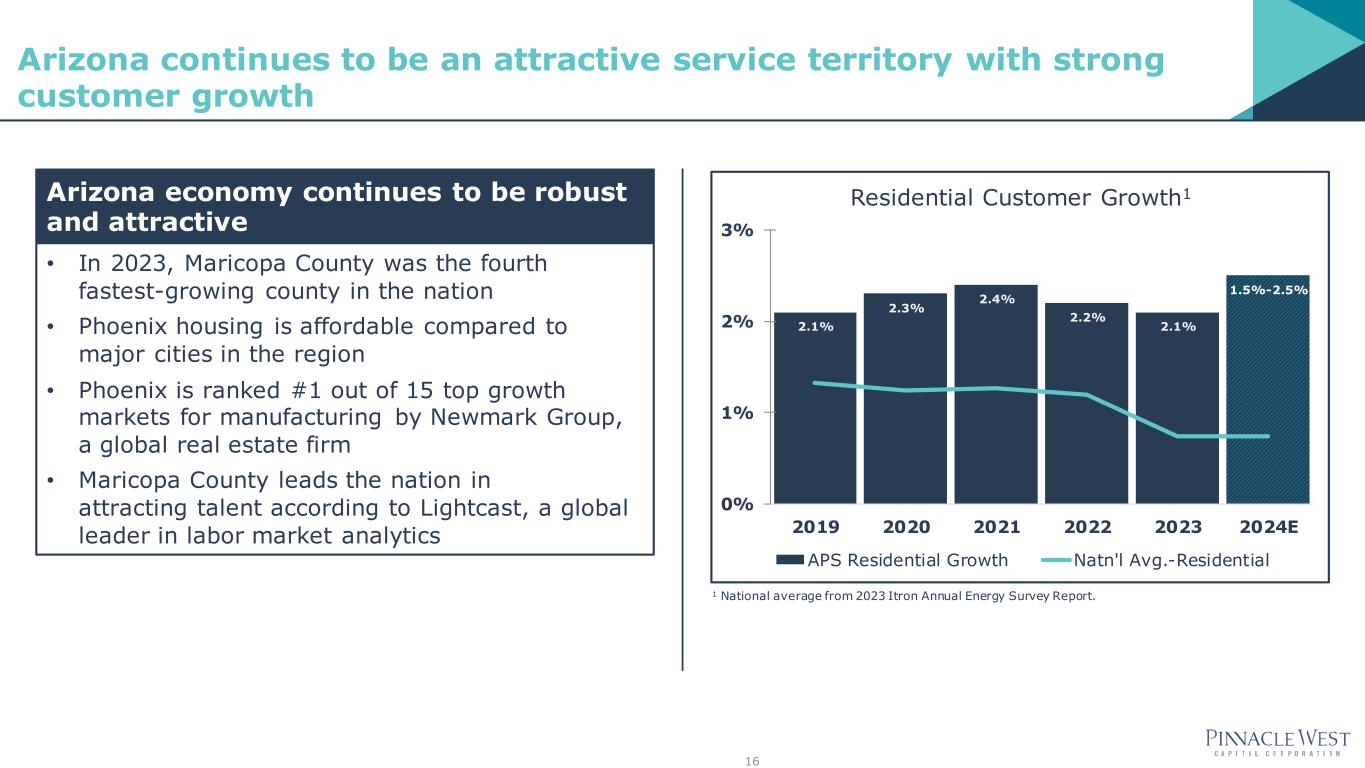 Progress Pathway 2005 2019 2030 2050 Since 2020, have contracted over 5,000 MW of clean energy and storage to be in service for APS customers by end of 2025 Issued 2023 All-Source RFP for approximately 1,000 MW of reliable capacity, including at least 700 MW of renewable resources Successfully received approval of the System Reliability Benefit Surcharge that will expand our capacity to self-build generation to meet customer need with reduced lag 24% 50% 65% 100% 15 We are making progress towards our Clean Energy Commitment