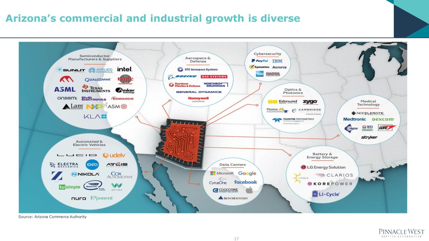 2.1% 2.3% 2.4% 2.2% 2.1% 1.5%-2.5% 0% 1% 2% 3% 2019 2020 2021 2022 2023 2024E Residential Customer Growth1 APS Residential Growth Natn'l Avg.-Residential 16 • In 2023, Maricopa County was the fourth fastest-growing county in the nation • Phoenix housing is affordable compared to major cities in the region • Phoenix is ranked #1 out of 15 top growth markets for manufacturing by Newmark Group, a global real estate firm • Maricopa County leads the nation in attracting talent according to Lightcast, a global leader in labor market analytics Arizona economy continues to be robust and attractive 1 National average from 2023 Itron Annual Energy Survey Report. Arizona continues to be an attractive service territory with strong customer growth