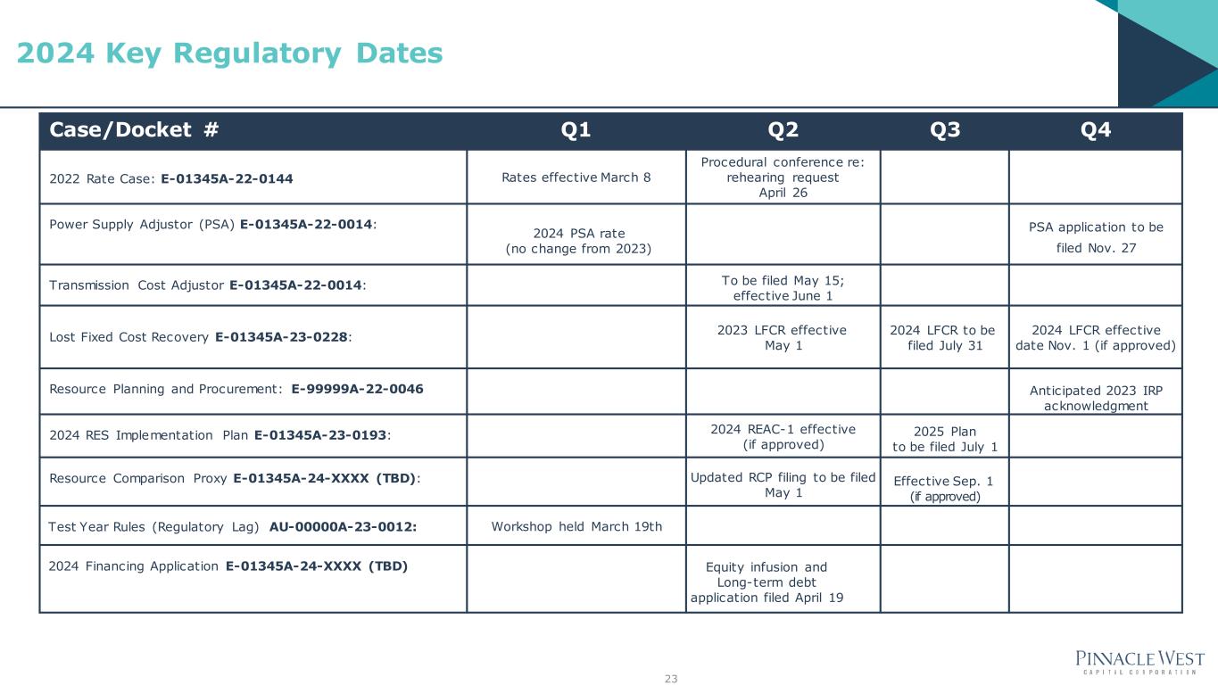 Case/Docket # Q1 Q2 Q3 Q4 2022 Rate Case: E-01345A-22-0144 Rates effective March 8 Procedural conference re: rehearing request April 26 Power Supply Adjustor (PSA) E-01345A-22-0014: 2024 PSA rate (no change from 2023) PSA application to be filed Nov. 27 Transmission Cost Adjustor E-01345A-22-0014: To be filed May 15; effective June 1 Lost Fixed Cost Recovery E-01345A-23-0228: 2023 LFCR effective May 1 2024 LFCR to be filed July 31 2024 LFCR effective date Nov. 1 (if approved) Resource Planning and Procurement: E-99999A-22-0046 Anticipated 2023 IRP acknowledgment 2024 RES Implementation Plan E-01345A-23-0193: 2024 REAC-1 effective (if approved) 2025 Plan to be filed July 1 Resource Comparison Proxy E-01345A-24-XXXX (TBD): Updated RCP filing to be filed May 1 Effective Sep. 1 (if approved) Test Year Rules (Regulatory Lag) AU-00000A-23-0012: Workshop held March 19th 2024 Financing Application E-01345A-24-XXXX (TBD) Equity infusion and Long-term debt application filed April 19 23 2024 Key Regulatory Dates