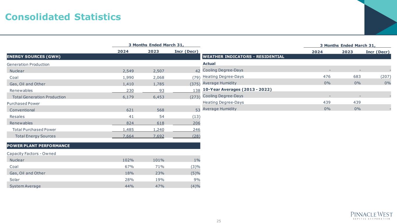 24 Consolidated Statistics 3 Months Ended March 31, 2024 2023 Incr (Decr) TOTAL OPERATING REVENUES (Dollars in Millions) Retail Residential $ 433 $ 410 23 Business 461 406 55 Total Retail 894 816 78 Sales for Resale (Wholesale) 27 96 (69) Transmission for Others 28 32 (4) Other Miscellaneous Services 3 2 1 Total Operating Revenues $ 952 $ 945 7 ELECTRIC SALES (GWH) Retail Residential 2,767 2,868 (101) Business 3,810 3,453 357 Total Retail 6,576 6,321 256 Sales for Resale (Wholesale) 1,334 1,046 288 Total Electric Sales 7,911 7,367 544 RETAIL SALES (GWH) - WEATHER NORMALIZED Residential 2,762 2,744 18 Business 3,830 3,483 347 Total Retail Sales 6,592 6,227 365 Retail sales (GWH) (% over prior year) 5.9% 3.6% 2.2% 3 Months Ended March 31, 2024 2023 Incr (Decr) AVERAGE ELECTRIC CUSTOMERS Retail Customers Residential 1,246,840 1,222,905 23,935 Business 143,677 142,425 1,252 Total Retail 1,390,517 1,365,330 25,187 Wholesale Customers 58 58 0 Total Customers 1,390,576 1,365,388 25,188 Total Customer Growth (% over prior year) 1.8% 2.0% (0.2)% RETAIL USAGE - WEATHER NORMALIZED (KWh/Average Customer) Residential 2,215 2,244 (29) Business 26,655 24,453 2,202