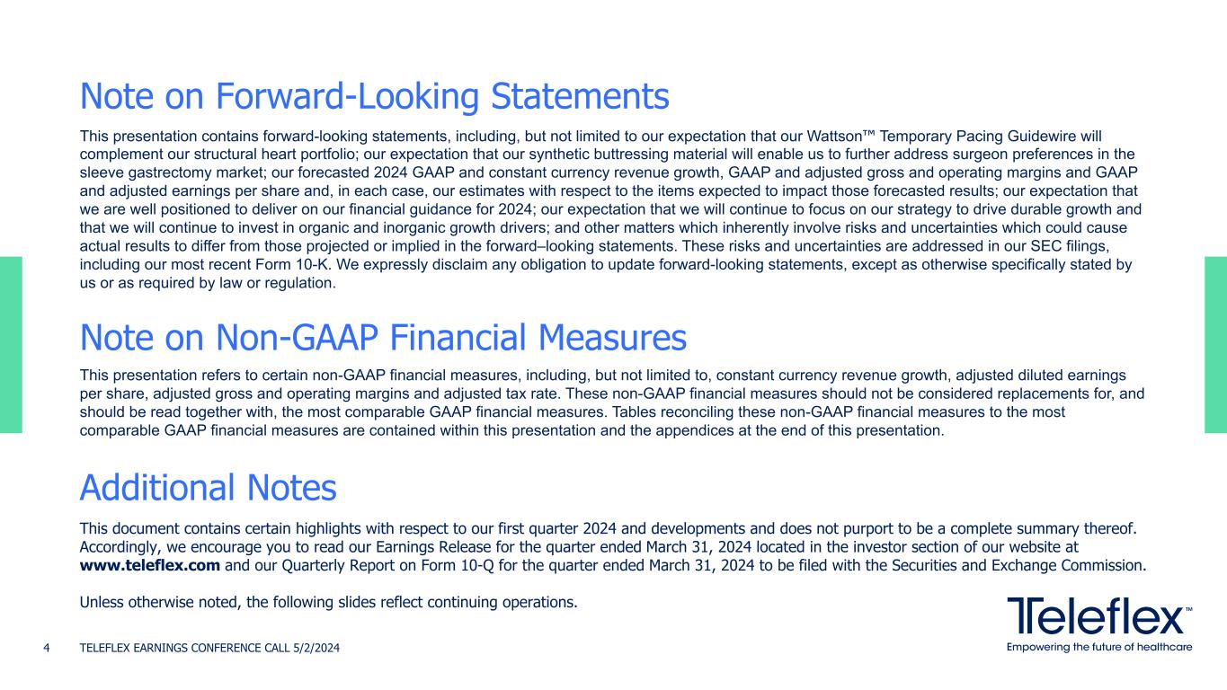 Q1 Performance Summary ◦ Maintained constant currency revenue growth guidance range of 3.75% to 4.75% ◦ Increased the low end of the range for adjusted diluted EPS from continuing operations guidance to $13.60 to $13.95, compared to the prior range of $13.55 to $13.95 ◦ Q1'24 constant currency revenue grew 3.8% year-over-year ◦ Q1'24 adjusted gross margin of 61.1% and adjusted operating margin of 26.6% ◦ Q1'24 adjusted EPS of $3.21, a 3.9% increase year-over-year Q1'24 Highlights 2024 Financial Guidance Note: See tables appearing in this presentation and the appendices hereto for reconciliations of non-GAAP financial information. TELEFLEX EARNINGS CONFERENCE CALL 5/2/2024