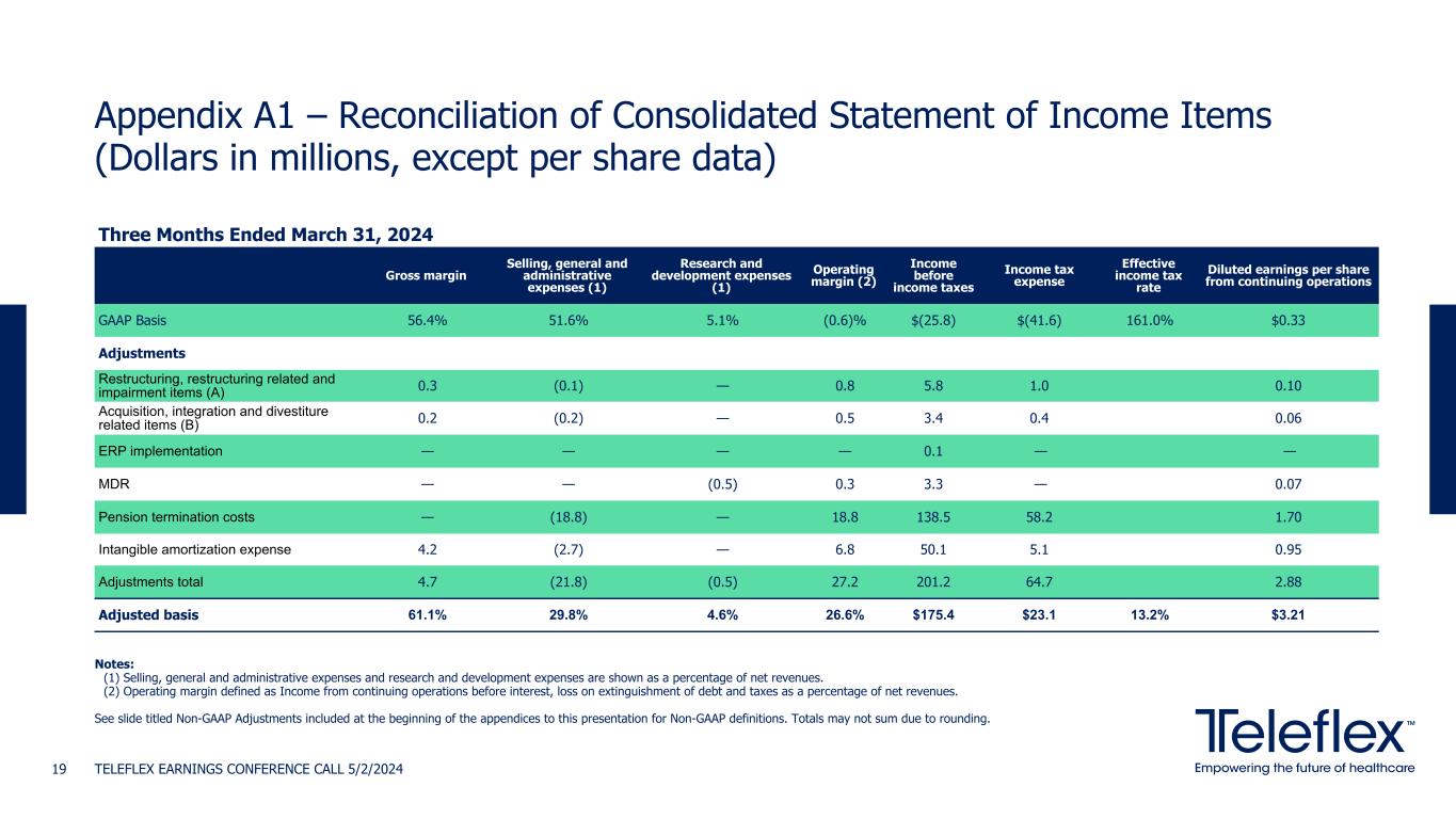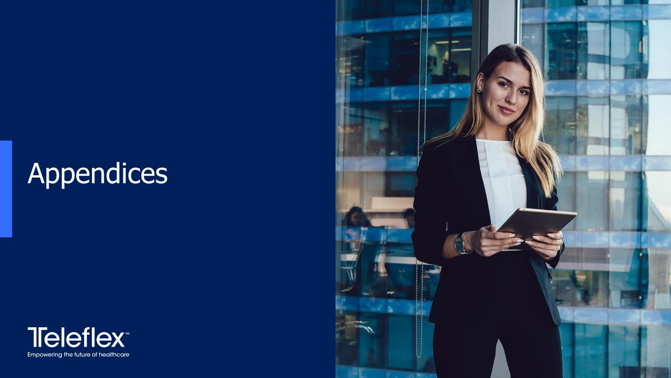 The following is an explanation of certain of the adjustments that are applied with respect to one or more of the non-GAAP financial measures that appear in the presentation to which these appendices are attached: Restructuring, restructuring related and impairment items - Restructuring programs involve discrete initiatives designed to, among other things, consolidate or relocate manufacturing, administrative and other facilities, outsource distribution operations, improve operating efficiencies and integrate acquired businesses. Depending on the specific restructuring program involved, our restructuring charges may include employee termination, contract termination, facility closure, employee relocation, equipment relocation, outplacement and other exit costs associated with the restructuring program. Restructuring related charges are directly related to our restructuring programs and consist of facility consolidation costs, including accelerated depreciation expense related to facility closures, costs to transfer manufacturing operations between locations, and retention bonuses offered to certain employees as an incentive for them to remain with our company after completion of the restructuring program. Impairment charges occur if, due to events or changes in circumstances, we determine that the carrying value of an asset exceeds its fair value. Impairment charges do not directly affect our liquidity, but could have a material adverse effect on our reported financial results. Acquisition, integration and divestiture related items - Acquisition and integration expenses are incremental charges, other than restructuring or restructuring related expenses, that are directly related to specific business or asset acquisition transactions. These charges may include, among other things, professional, consulting and other fees; systems integration costs; inventory step-up amortization (amortization, through cost of goods sold, of the increase in fair value of inventory resulting from a fair value calculation as of the acquisition date); fair value adjustments to contingent consideration liabilities; and bridge loan facility and backstop financing fees in connection with loan facilities that ultimately were not utilized. Divestiture related activities involve specific business or asset sales. Depending primarily on the terms of a divestiture transaction, the carrying value of the divested business or assets on our financial statements and other costs we incur as a direct result of the divestiture transaction, we may recognize a gain or loss in connection with the divestiture related activities. Pension termination and related charges - These adjustments represent charges associated with the planned termination of the Teleflex Incorporated Retirement Income Plan, a frozen U.S. defined benefit pension plan, and related direct incremental costs. These charges and costs do not represent normal and recurring operating expenses, will be inconsistent in amounts and frequency, and are not expected to recur once the plan termination process has been completed. Accordingly, management has excluded these amounts to facilitate an evaluation of our current operating performance and a comparison to our past operating performance. Non-GAAP Adjustments TELEFLEX EARNINGS CONFERENCE CALL 5/2/202417
