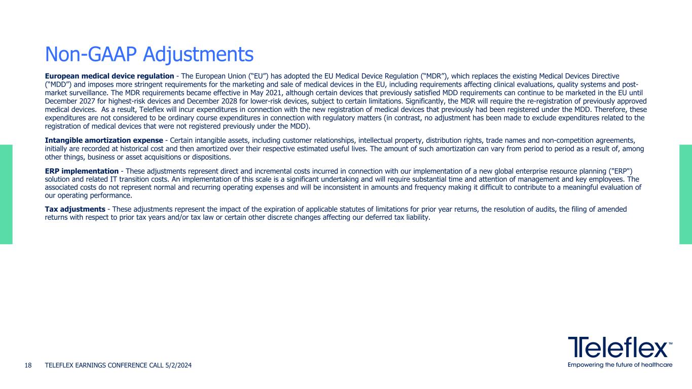 European medical device regulation - The European Union (“EU”) has adopted the EU Medical Device Regulation (“MDR”), which replaces the existing Medical Devices Directive (“MDD”) and imposes more stringent requirements for the marketing and sale of medical devices in the EU, including requirements affecting clinical evaluations, quality systems and post- market surveillance. The MDR requirements became effective in May 2021, although certain devices that previously satisfied MDD requirements can continue to be marketed in the EU until December 2027 for highest-risk devices and December 2028 for lower-risk devices, subject to certain limitations. Significantly, the MDR will require the re-registration of previously approved medical devices. As a result, Teleflex will incur expenditures in connection with the new registration of medical devices that previously had been registered under the MDD. Therefore, these expenditures are not considered to be ordinary course expenditures in connection with regulatory matters (in contrast, no adjustment has been made to exclude expenditures related to the registration of medical devices that were not registered previously under the MDD). Intangible amortization expense - Certain intangible assets, including customer relationships, intellectual property, distribution rights, trade names and non-competition agreements, initially are recorded at historical cost and then amortized over their respective estimated useful lives. The amount of such amortization can vary from period to period as a result of, among other things, business or asset acquisitions or dispositions. ERP implementation - These adjustments represent direct and incremental costs incurred in connection with our implementation of a new global enterprise resource planning ("ERP") solution and related IT transition costs. An implementation of this scale is a significant undertaking and will require substantial time and attention of management and key employees. The associated costs do not represent normal and recurring operating expenses and will be inconsistent in amounts and frequency making it difficult to contribute to a meaningful evaluation of our operating performance. Tax adjustments - These adjustments represent the impact of the expiration of applicable statutes of limitations for prior year returns, the resolution of audits, the filing of amended returns with respect to prior tax years and/or tax law or certain other discrete changes affecting our deferred tax liability. Non-GAAP Adjustments TELEFLEX EARNINGS CONFERENCE CALL 5/2/202418