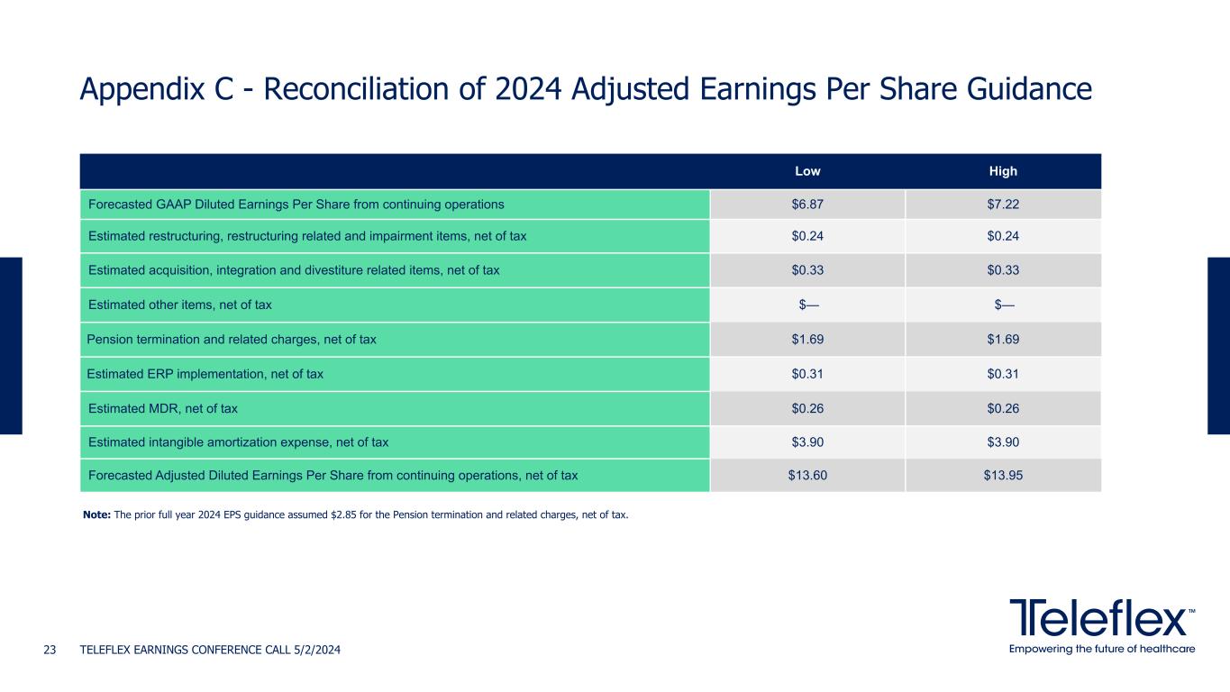 Appendix C - Reconciliation of 2024 Adjusted Earnings Per Share Guidance TELEFLEX EARNINGS CONFERENCE CALL 5/2/202423 Low High Forecasted GAAP Diluted Earnings Per Share from continuing operations $6.87 $7.22 Estimated restructuring, restructuring related and impairment items, net of tax $0.24 $0.24 Estimated acquisition, integration and divestiture related items, net of tax $0.33 $0.33 Estimated other items, net of tax $— $— Pension termination and related charges, net of tax $1.69 $1.69 Estimated ERP implementation, net of tax $0.31 $0.31 Estimated MDR, net of tax $0.26 $0.26 Estimated intangible amortization expense, net of tax $3.90 $3.90 Forecasted Adjusted Diluted Earnings Per Share from continuing operations, net of tax $13.60 $13.95 Note: The prior full year 2024 EPS guidance assumed $2.85 for the Pension termination and related charges, net of tax.