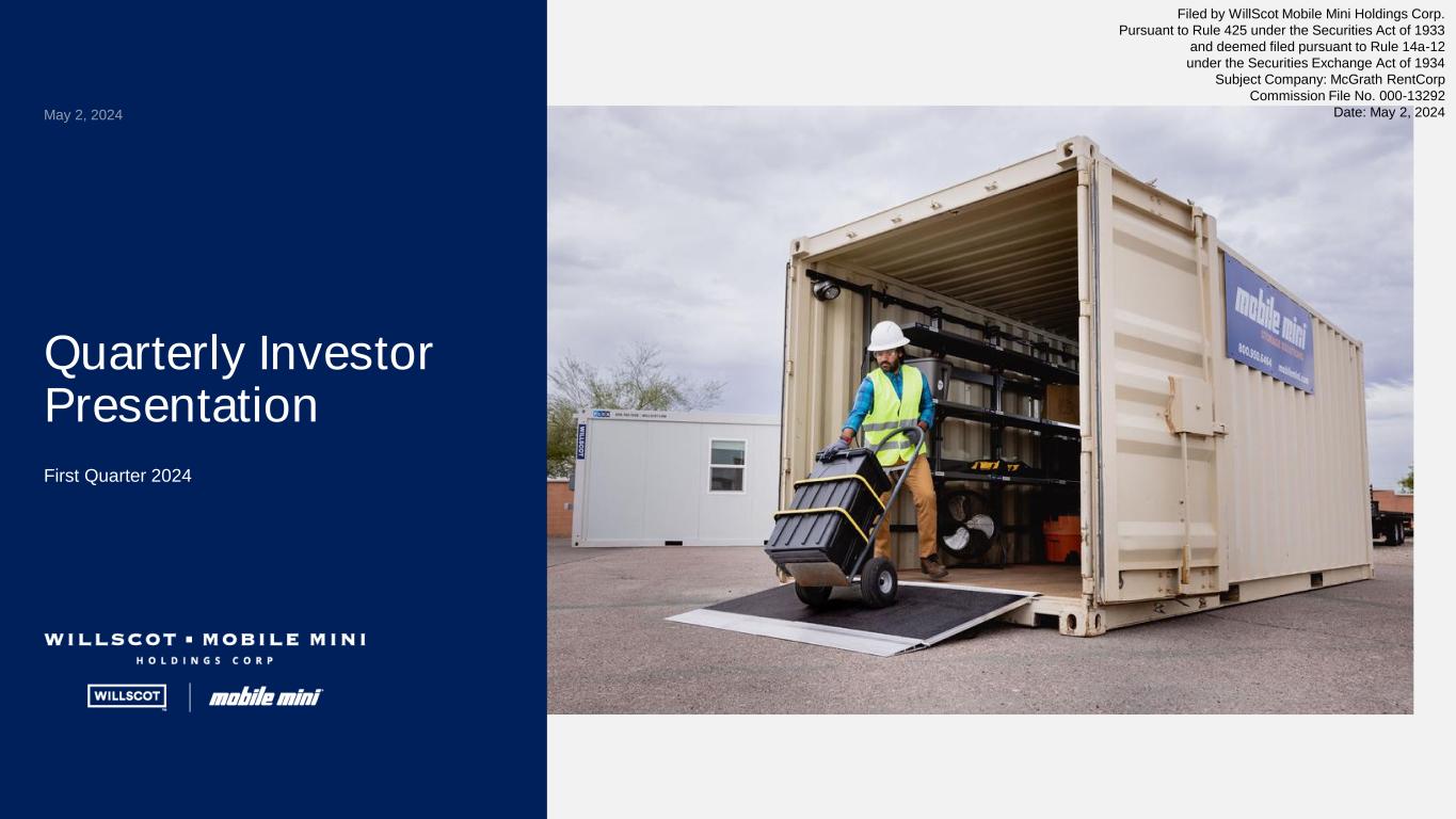 Quarterly Investor Presentation May 2, 2024 First Quarter 2024 Filed by WillScot Mobile Mini Holdings Corp. Pursuant to Rule 425 under the Securities Act of 1933 and deemed filed pursuant to Rule 14a-12 under the Securities Exchange Act of 1934 Subject Company: McGrath RentCorp Commission File No. 000-13292 Date: May 2, 2024