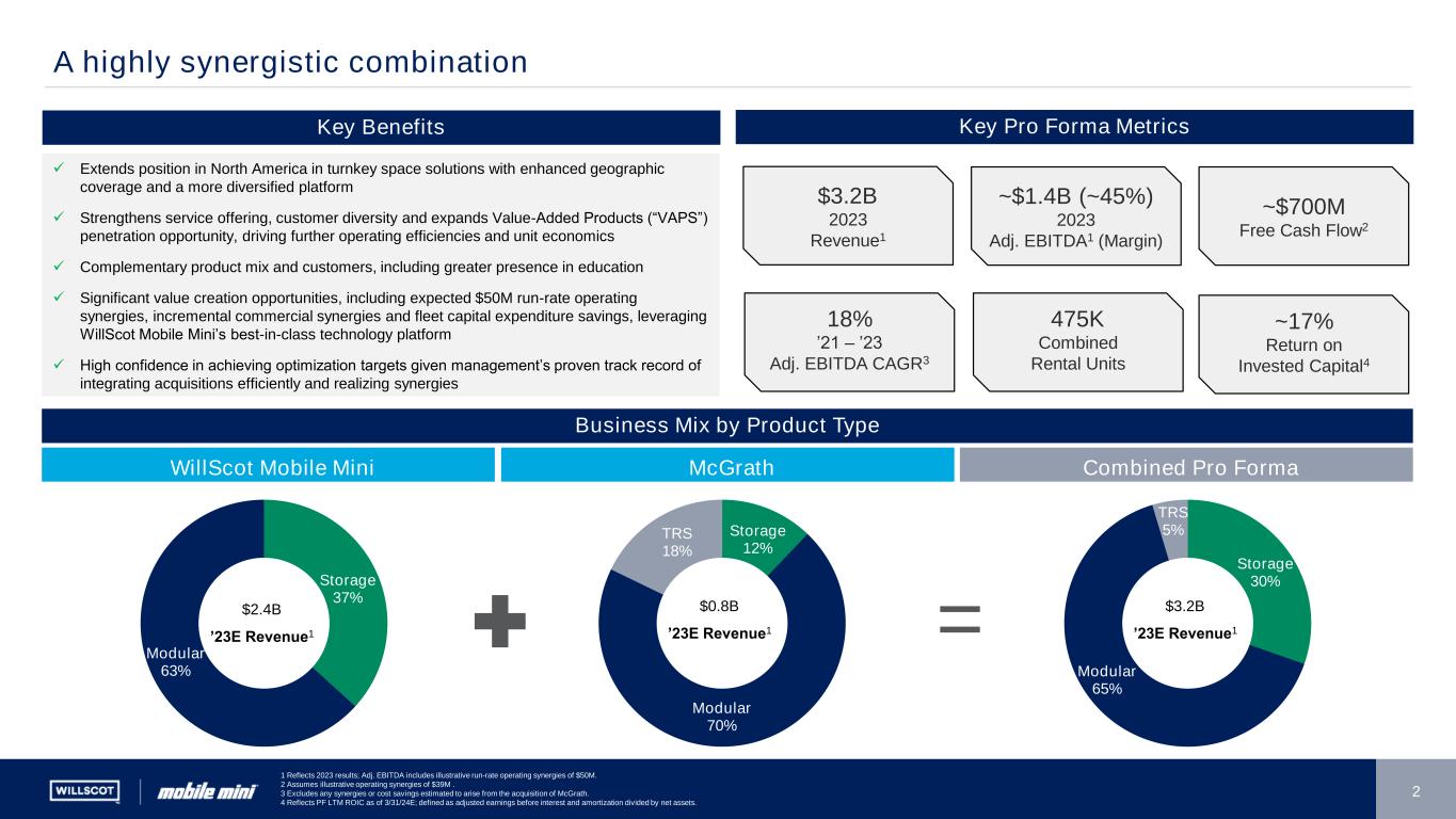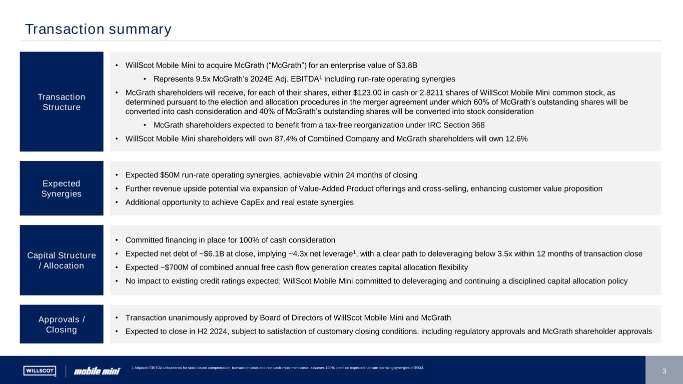 2 A highly synergistic combination Storage 30% Modular 65% TRS 5%Storage 12% Modular 70% TRS 18% Storage 37% Modular 63% $2.4B ’23E Revenue1 ✓ Extends position in North America in turnkey space solutions with enhanced geographic coverage and a more diversified platform ✓ Strengthens service offering, customer diversity and expands Value-Added Products (“VAPS”) penetration opportunity, driving further operating efficiencies and unit economics ✓ Complementary product mix and customers, including greater presence in education ✓ Significant value creation opportunities, including expected $50M run-rate operating synergies, incremental commercial synergies and fleet capital expenditure savings, leveraging WillScot Mobile Mini’s best-in-class technology platform ✓ High confidence in achieving optimization targets given management’s proven track record of integrating acquisitions efficiently and realizing synergies Key Benefits Business Mix by Product Type Combined Pro Forma $3.2B 2023 Revenue1 ~$1.4B (~45%) 2023 Adj. EBITDA1 (Margin) 18% ’21 – ’23 Adj. EBITDA CAGR3 ~17% Return on Invested Capital4 475K Combined Rental Units Key Pro Forma Metrics WillScot Mobile Mini McGrath =$0.8B ’23E Revenue1 $3.2B ’23E Revenue1 ~$700M Free Cash Flow2 1 Reflects 2023 results; Adj. EBITDA includes illustrative run-rate operating synergies of $50M. 2 Assumes illustrative operating synergies of $39M . 3 Excludes any synergies or cost savings estimated to arise from the acquisition of McGrath. 4 Reflects PF LTM ROIC as of 3/31/24E; defined as adjusted earnings before interest and amortization divided by net assets.