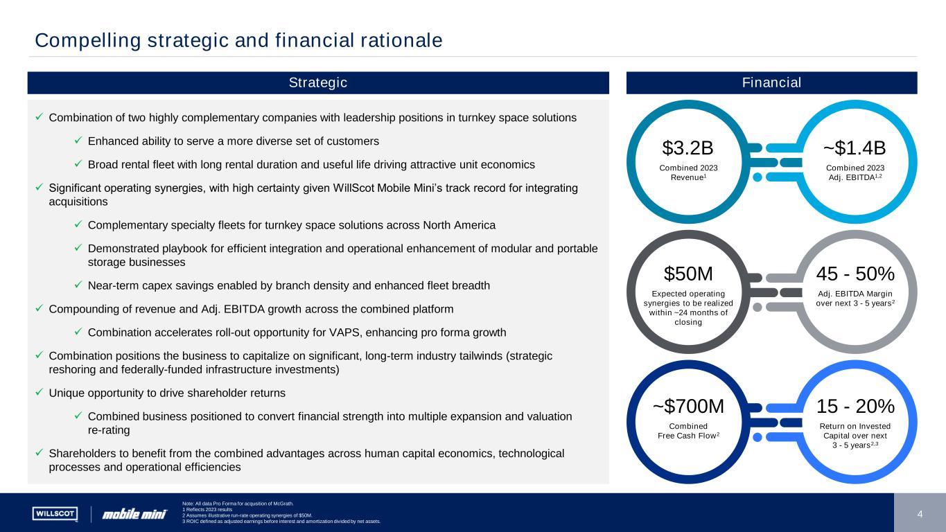 3 Transaction summary • WillScot Mobile Mini to acquire McGrath (“McGrath”) for an enterprise value of $3.8B • Represents 9.5x McGrath’s 2024E Adj. EBITDA1 including run-rate operating synergies • McGrath shareholders will receive, for each of their shares, either $123.00 in cash or 2.8211 shares of WillScot Mobile Mini common stock, as determined pursuant to the election and allocation procedures in the merger agreement under which 60% of McGrath’s outstanding shares will be converted into cash consideration and 40% of McGrath’s outstanding shares will be converted into stock consideration • McGrath shareholders expected to benefit from a tax-free reorganization under IRC Section 368 • WillScot Mobile Mini shareholders will own 87.4% of Combined Company and McGrath shareholders will own 12.6% Transaction Structure Expected Synergies • Expected $50M run-rate operating synergies, achievable within 24 months of closing • Further revenue upside potential via expansion of Value-Added Product offerings and cross-selling, enhancing customer value proposition • Additional opportunity to achieve CapEx and real estate synergies Capital Structure / Allocation • Committed financing in place for 100% of cash consideration • Expected net debt of ~$6.1B at close, implying ~4.3x net leverage1, with a clear path to deleveraging below 3.5x within 12 months of transaction close • Expected ~$700M of combined annual free cash flow generation creates capital allocation flexibility • No impact to existing credit ratings expected; WillScot Mobile Mini committed to deleveraging and continuing a disciplined capital allocation policy Approvals / Closing • Transaction unanimously approved by Board of Directors of WillScot Mobile Mini and McGrath • Expected to close in H2 2024, subject to satisfaction of customary closing conditions, including regulatory approvals and McGrath shareholder approvals 1 Adjusted EBITDA unburdened for stock-based compensation, transaction costs and non-cash impairment costs; assumes 100% credit on expected run-rate operating synergies of $50M.