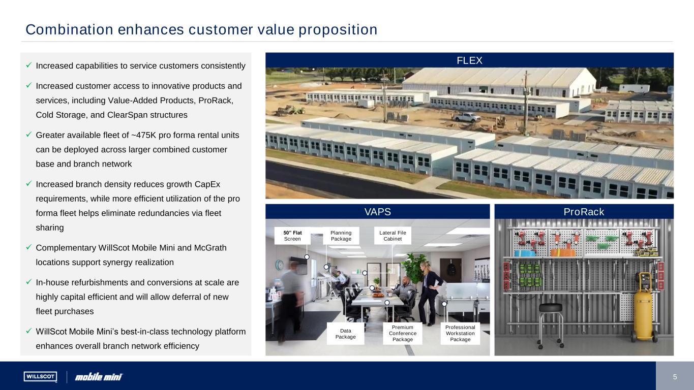 4 Compelling strategic and financial rationale Strategic ✓ Combination of two highly complementary companies with leadership positions in turnkey space solutions ✓ Enhanced ability to serve a more diverse set of customers ✓ Broad rental fleet with long rental duration and useful life driving attractive unit economics ✓ Significant operating synergies, with high certainty given WillScot Mobile Mini’s track record for integrating acquisitions ✓ Complementary specialty fleets for turnkey space solutions across North America ✓ Demonstrated playbook for efficient integration and operational enhancement of modular and portable storage businesses ✓ Near-term capex savings enabled by branch density and enhanced fleet breadth ✓ Compounding of revenue and Adj. EBITDA growth across the combined platform ✓ Combination accelerates roll-out opportunity for VAPS, enhancing pro forma growth ✓ Combination positions the business to capitalize on significant, long-term industry tailwinds (strategic reshoring and federally-funded infrastructure investments) ✓ Unique opportunity to drive shareholder returns ✓ Combined business positioned to convert financial strength into multiple expansion and valuation re-rating ✓ Shareholders to benefit from the combined advantages across human capital economics, technological processes and operational efficiencies Financial $3.2B Combined 2023 Revenue1 45 - 50% Adj. EBITDA Margin over next 3 - 5 years2 ~$700M Combined Free Cash Flow2 $50M Expected operating synergies to be realized within ~24 months of closing 15 - 20% Return on Invested Capital over next 3 - 5 years2,3 ~$1.4B Combined 2023 Adj. EBITDA1,2 Note: All data Pro Forma for acqusition of McGrath. 1 Reflects 2023 results 2 Assumes illustrative run-rate operating synergies of $50M. 3 ROIC defined as adjusted earnings before interest and amortization divided by net assets.
