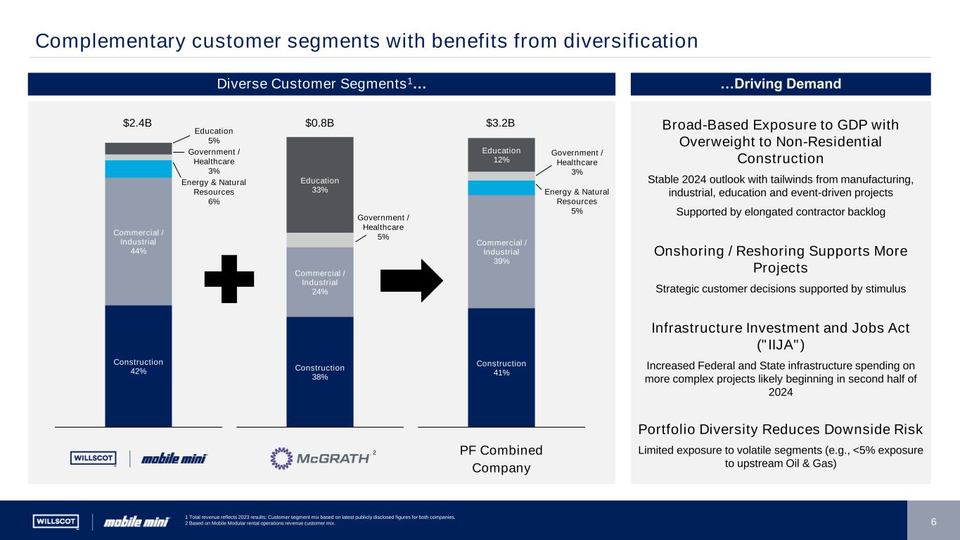 5 Combination enhances customer value proposition ✓ Increased capabilities to service customers consistently ✓ Increased customer access to innovative products and services, including Value-Added Products, ProRack, Cold Storage, and ClearSpan structures ✓ Greater available fleet of ~475K pro forma rental units can be deployed across larger combined customer base and branch network ✓ Increased branch density reduces growth CapEx requirements, while more efficient utilization of the pro forma fleet helps eliminate redundancies via fleet sharing ✓ Complementary WillScot Mobile Mini and McGrath locations support synergy realization ✓ In-house refurbishments and conversions at scale are highly capital efficient and will allow deferral of new fleet purchases ✓ WillScot Mobile Mini’s best-in-class technology platform enhances overall branch network efficiency FLEX VAPS Data Package Planning Package Lateral File Cabinet 50” Flat Screen Professional Workstation Package Premium Conference Package ProRack