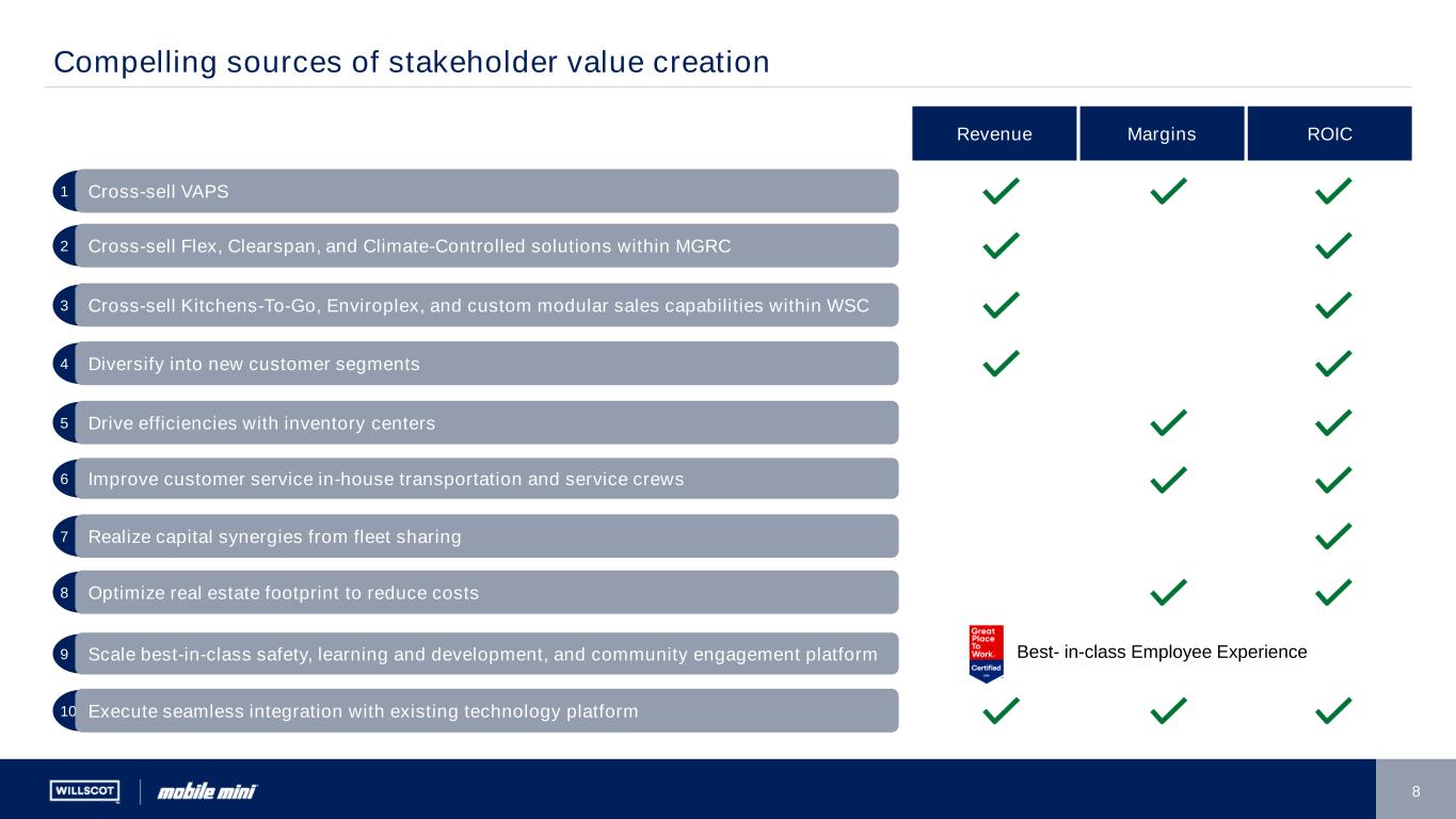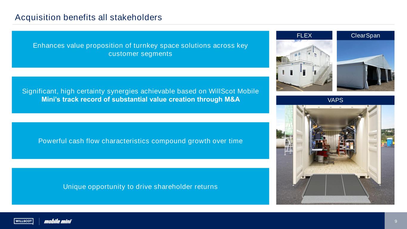 8 Compelling sources of stakeholder value creation 1 Cross-sell VAPS 2 Cross-sell Flex, Clearspan, and Climate-Controlled solutions within MGRC 3 Cross-sell Kitchens-To-Go, Enviroplex, and custom modular sales capabilities within WSC 4 Diversify into new customer segments 5 Drive efficiencies with inventory centers 6 Improve customer service in-house transportation and service crews 7 Realize capital synergies from fleet sharing 8 Optimize real estate footprint to reduce costs 9 Scale best-in-class safety, learning and development, and community engagement platform 10 Execute seamless integration with existing technology platform Revenue Margins ROIC Best- in-class Employee Experience