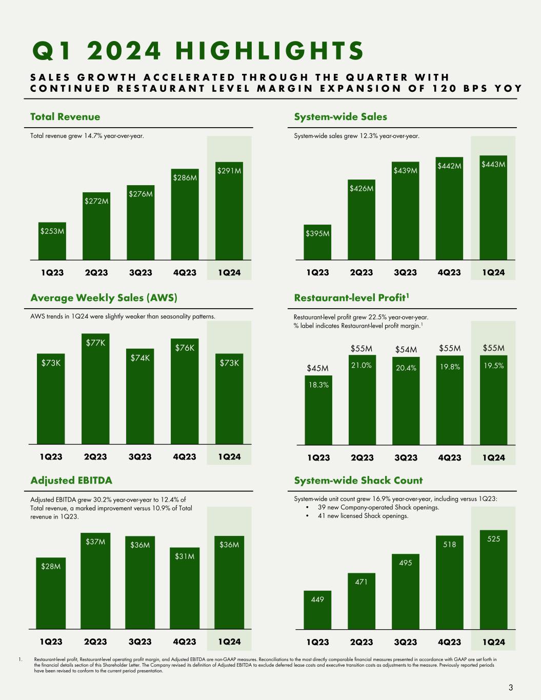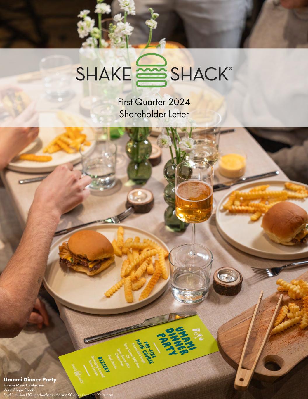 “Our first quarter results showed the continued execution of our Strategic Priorities. This marks the thirteenth straight quarter of positive SSS %, with February and March combined traffic improving compared to January levels, and a strong 4.9% SSS in fiscal April. This was the twelfth straight quarter of Adj. EBITDA growth, and we continue to show consistent improvement in Restaurant- level profit margin and disciplined G&A investment. As announced, I will transition CEO leadership to Rob Lynch on May 20th and remain in an advisor role through the year. I remain ever-optimistic for the future at Shake Shack and am confident this team will continue to thrive,” said Chief Executive Officer, Randy Garutti. “We laid a strong foundation in the first quarter as we plan to drive profitable sales and expand margins again in 2024, by growing revenue by 15% year-over-year, expanding Restaurant-level profit margins by 120 bps, and growing Adjusted EBITDA by more than 30% year-over-year. Our teams are executing on our 2024 strategies to drive better overall guest experience, grow sales, expand Restaurant-level profit margins, and lower build costs as we look to grow sales year-over-year by 12% - 15% and Adjusted EBITDA by 21% - 29% to $160m - $170m,” said Chief Financial Officer, Katie Fogertey. Q 1 2 0 2 4 H I G H L I G H T S System-wide Sales $443.3m 12.3% growth year-over-year. Same-Shack Sales (SSS) Growth +1.6% Sales trends improved throughout the quarter, led by strategic focus on driving sales and awareness, as well as operational focus on the guest experience. Restaurant-level Profit Margin1 19.5% 120 bps higher versus last year and strongest first quarter result since 2019. 2 B U S I N E S S O V E R V I E W 1. Restaurant-level profit, Restaurant-level profit margin, Adjusted EBITDA and Adjusted pro forma net income (loss) are non-GAAP measures. Reconciliations to the most directly comparable financial measures presented in accordance with GAAP are set forth in the financial details section of this Shareholder Letter. FIRST QUARTER 2024 HIGHLIGHTS: • Total revenue grew 14.7% year-over-year to $290.5m. • Shack sales grew 14.9% year-over-year to $280.6m. • Licensing revenue grew 10.3% year-over-year to $9.9m. • System-wide sales grew 12.3% year-over-year to $443.3m. • Average weekly sales (AWS) was flat year-over-year at $73k. • Same-Shack sales (SSS) grew 1.6% year-over-year, with trends improving each month of the quarter. April SSS grew 4.9% year-over-year. • Operating income of $0.0m versus operating loss of $3.2m last year. • Restaurant-level profit margin1 of 19.5% of Shack sales, 120 bps improvement year-over-year. • Net income of $2.2m versus net loss of $1.6m last year. • Adjusted EBITDA1 of $35.9m, up 30.2% year-over-year. • Net income attributable to Shake Shack Inc. of $2.0m, or earnings of $0.05 per diluted share. • Adjusted pro forma net income1 of $5.6m, or earnings of $0.13 per fully exchanged and diluted share. • Opened four new Company-operated Shacks, including two drive-thrus. Opened four new licensed Shacks.