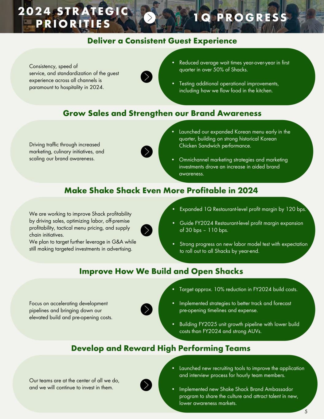 4 TO O U R S H A R E H O L D E R S We are proud of the results from the first quarter that marked the thirteenth consecutive quarter of positive same- Shack sales, and our momentum improved throughout the quarter. April same-Shack sales was 4.9% and our trends in fiscal May have continued to be strong as our sales and profitability initiatives take hold. Executing on our profitability improvement plans in our Shacks, we expanded Restaurant-level profit margins by 120 bps to 19.5% - our strongest first quarter Restaurant-level profit margin since 2019 and our seventh straight quarter of Restaurant-level profit margin expansion. With this, and the improvements we are showing in G&A and other expenses, we grew our Adjusted EBITDA over 30% year-over-year to $35.9m, marking the highest first quarter Adjusted EBITDA, and expanded Adjusted EBITDA margin 150 bps to 12.4% of Total Revenue. We believe our 2024 Strategic Priorities are the right plan for us to deliver another year of strong, profitable growth to our shareholders. In the first quarter of the year, we have already showed strong progress against our goals, including delivering a better guest experience as more than half of our Shacks reduced the average wait time by at least 15 seconds. We also grew our brand awareness and sales with thoughtful investments in marketing as we learn and grow into a larger marketing budget over time. Our focus on operational improvements is seen with another quarter of year-on-year expansion in our Restaurant-level profit margins and leveraging our G&A investments. On development, we are on path to open approximately 80 Shacks system- wide this year with lower build costs on the Company-operated side versus last year. And the foundation of all our progress is the commitment we have to supporting our teams. In FY2024, we expect to grow Total revenue by 12% – 15% year-over-year to ~$1.22b – $1.25b, expand Restaurant-level profit margin to 20.2% – 21.0%, grow Adjusted EBITDA by 21% - 29% year-over-year to $160m – $170m, and open ~80 new Shacks, ~40 Company-operated and ~40 licensed. May 2, 2024 Penn Station, New York