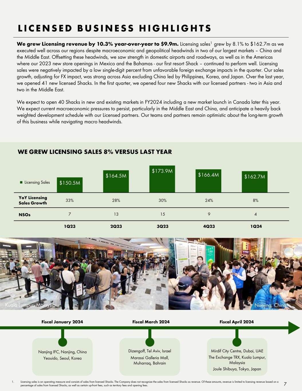 L I C E N S E D B U S I N E S S H I G H L I G H T S 1. Licensing sales is an operating measure and consists of sales from licensed Shacks. The Company does not recognize the sales from licensed Shacks as revenue. Of these amounts, revenue is limited to licensing revenue based on a percentage of sales from licensed Shacks, as well as certain up-front fees, such as territory fees and opening fees. 7 Nanjing IFC, Nanjing, China Yeouido, Seoul, Korea Fiscal January 2024 Fiscal March 2024 Fiscal April 2024 Dizengoff, Tel Aviv, Israel Marassi Galleria Mall, Muharraq, Bahrain Mirdif City Centre, Dubai, UAE The Exchange TRX, Kuala Lumpur, Malaysia Joule Shibuya, Tokyo, Japan $150.5M $164.5M $173.9M $166.4M $162.7M Licensing Sales WE GREW LICENSING SALES 8% VERSUS LAST YEAR 33% 28% 30% YoY Licensing Sales Growth 24% 8% 7 13 15 9 4NSOs We grew Licensing revenue by 10.3% year-over-year to $9.9m. Licensing sales1 grew by 8.1% to $162.7m as we executed well across our regions despite macroeconomic and geopolitical headwinds in two of our largest markets – China and the Middle East. Offsetting these headwinds, we saw strength in domestic airports and roadways, as well as in the Americas where our 2023 new store openings in Mexico and the Bahamas - our first resort Shack – continued to perform well. Licensing sales were negatively impacted by a low single-digit percent from unfavorable foreign exchange impacts in the quarter. Our sales growth, adjusting for FX impact, was strong across Asia excluding China led by Philippines, Korea, and Japan. Over the last year, we opened 41 new licensed Shacks. In the first quarter, we opened four new Shacks with our licensed partners - two in Asia and two in the Middle East. We expect to open 40 Shacks in new and existing markets in FY2024 including a new market launch in Canada later this year. We expect current macroeconomic pressures to persist, particularly in the Middle East and China, and anticipate a heavily back weighted development schedule with our Licensed partners. Our teams and partners remain optimistic about the long-term growth of this business while navigating macro headwinds. 1Q23 2Q23 3Q23 4Q23 1Q24 Nanjing, ChinaKuala Lumpur, Malaysia