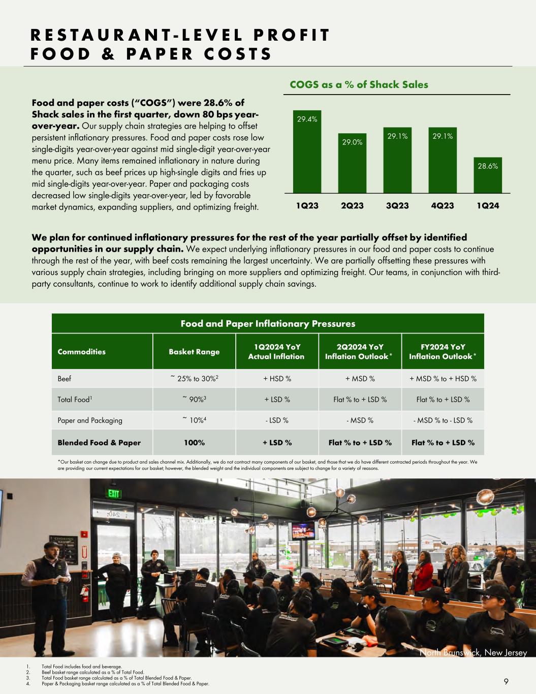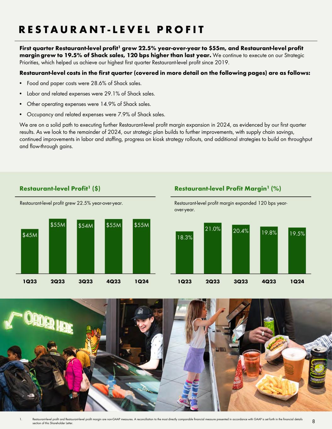 8 R E S T A U R A N T - L E V E L P R O F I T First quarter Restaurant-level profit1 grew 22.5% year-over-year to $55m, and Restaurant-level profit margin grew to 19.5% of Shack sales, 120 bps higher than last year. We continue to execute on our Strategic Priorities, which helped us achieve our highest first quarter Restaurant-level profit since 2019. Restaurant-level costs in the first quarter (covered in more detail on the following pages) are as follows: • Food and paper costs were 28.6% of Shack sales. • Labor and related expenses were 29.1% of Shack sales. • Other operating expenses were 14.9% of Shack sales. • Occupancy and related expenses were 7.9% of Shack sales. We are on a solid path to executing further Restaurant-level profit margin expansion in 2024, as evidenced by our first quarter results. As we look to the remainder of 2024, our strategic plan builds to further improvements, with supply chain savings, continued improvements in labor and staffing, progress on kiosk strategy rollouts, and additional strategies to build on throughput and flow-through gains. 1. Restaurant-level profit and Restaurant-level profit margin are non-GAAP measures. A reconciliation to the most directly comparable financial measure presented in accordance with GAAP is set forth in the financial details section of this Shareholder Letter. $45M $55M $54M $55M $55M 1Q23 2Q23 3Q23 4Q23 1Q24 Restaurant-level Profit1 ($) 18.3% 21.0% 20.4% 19.8% 19.5% 1Q23 2Q23 3Q23 4Q23 1Q24 Restaurant-level Profit Margin1 (%) Restaurant-level profit grew 22.5% year-over-year. Restaurant-level profit margin expanded 120 bps year- over-year.
