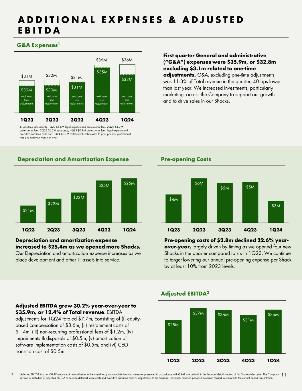 Occupancy and related expenses (“Occupancy”) were 7.9% of Shack sales in the first quarter, up 30 bps year-over-year as we saw impacts from higher occupancy taxes and sales deleverage. Other operating expenses (“Other opex”) were 14.9% of Shack sales in the first quarter, up 60 bps year-over-year. The increase was primarily driven by our targeted marketing investments aimed to drive sales at the Shack level. 7.6% 7.6% 7.7% 7.7% 1Q23 2Q23 3Q23 4Q23 1Q24 14.3% 13.8% 14.1% 14.9% 14.9% 1Q23 2Q23 3Q23 4Q23 1Q24 R E S T A U R A N T - L E V E L P R O F I T L A B O R , O T H E R O P E X & O C C U P A N C Y 30.4% 28.7% 28.8% 28.5% 29.1% 1Q23 2Q23 3Q23 4Q23 1Q24 Labor as a % of Shack Sales Labor and related expenses (“Labor”) were 29.1% of Shack sales in the first quarter, down 130 bps year-over-year. We showed strong leverage in the first quarter, driven by the benefits from our operational improvement plan including dynamic labor forecasting and scheduling. We expect low single-digit wage inflation for 2024 as we make continued investments in our team members. Occupancy as a % of Shack Sales Other Opex as a % of Shack Sales 10 7.9%