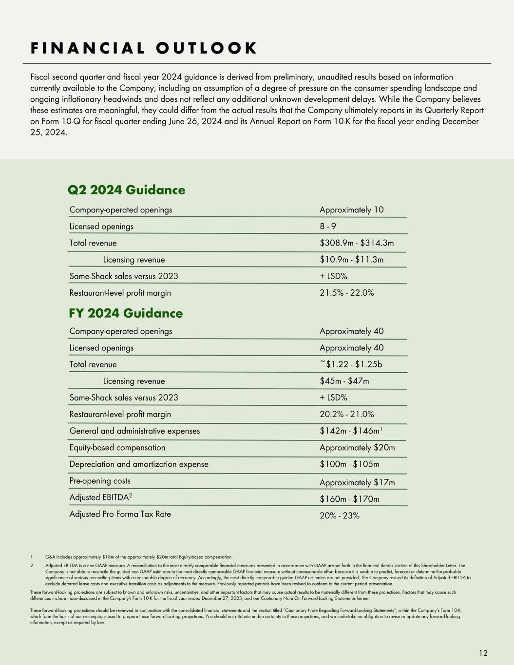 Fiscal second quarter and fiscal year 2024 guidance is derived from preliminary, unaudited results based on information currently available to the Company, including an assumption of a degree of pressure on the consumer spending landscape and ongoing inflationary headwinds and does not reflect any additional unknown development delays. While the Company believes these estimates are meaningful, they could differ from the actual results that the Company ultimately reports in its Quarterly Report on Form 10-Q for fiscal quarter ending June 26, 2024 and its Annual Report on Form 10-K for the fiscal year ending December 25, 2024. F I N A N C I A L O U T L O O K 12 1. G&A includes approximately $18m of the approximately $20m total Equity-based compensation. 2. Adjusted EBITDA is a non-GAAP measure. A reconciliation to the most directly comparable financial measures presented in accordance with GAAP are set forth in the financial details section of this Shareholder Letter. The Company is not able to reconcile the guided non-GAAP estimates to the most directly comparable GAAP financial measure without unreasonable effort because it is unable to predict, forecast or determine the probable significance of various reconciling items with a reasonable degree of accuracy. Accordingly, the most directly comparable guided GAAP estimates are not provided. The Company revised its definition of Adjusted EBITDA to exclude deferred lease costs and executive transition costs as adjustments to the measure. Previously reported periods have been revised to conform to the current period presentation. These forward-looking projections are subject to known and unknown risks, uncertainties, and other important factors that may cause actual results to be materially different from these projections. Factors that may cause such differences include those discussed in the Company's Form 10-K for the fiscal year ended December 27, 2023, and our Cautionary Note On Forward-Looking Statements herein. These forward-looking projections should be reviewed in conjunction with the consolidated financial statements and the section titled “Cautionary Note Regarding Forward-Looking Statements”, within the Company’s Form 10-K, which form the basis of our assumptions used to prepare these forward-looking projections. You should not attribute undue certainty to these projections, and we undertake no obligation to revise or update any forward-looking information, except as required by law. Company-operated openings Licensed openings Total revenue Licensing revenue Same-Shack sales versus 2023 Restaurant-level profit margin Company-operated openings Licensed openings Total revenue Licensing revenue Same-Shack sales versus 2023 Restaurant-level profit margin General and administrative expenses Equity-based compensation Depreciation and amortization expense Pre-opening costs Adjusted EBITDA2 Adjusted Pro Forma Tax Rate Approximately 10 8 - 9 $308.9m - $314.3m $10.9m - $11.3m + LSD% 21.5% - 22.0% Approximately 40 Approximately 40 ~$1.22 - $1.25b $45m - $47m + LSD% 20.2% - 21.0% $142m - $146m1 Approximately $20m $100m - $105m Approximately $17m $160m - $170m 20% - 23% Q2 2024 Guidance FY 2024 Guidance