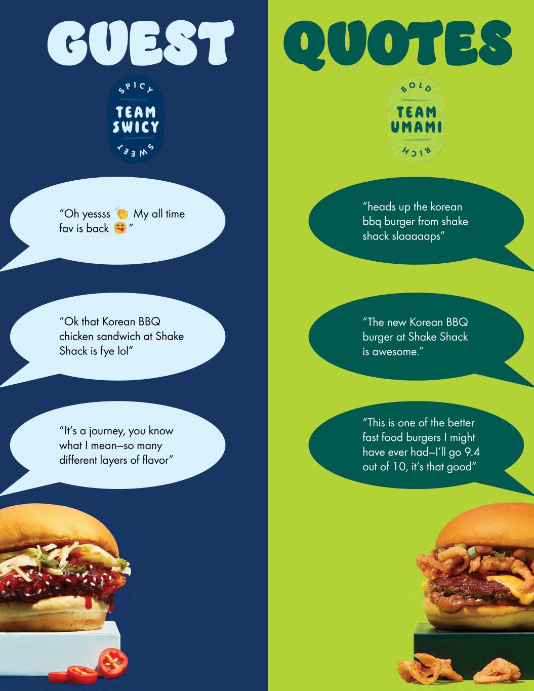 GUEST QUOTES “heads up the korean bbq burger from shake shack slaaaaaps” “The new Korean BBQ burger at Shake Shack is awesome.” “This is one of the better fast food burgers I might have ever had—I’ll go 9.4 out of 10, it’s that good” “Oh yessss My all time fav is back ” “Ok that Korean BBQ chicken sandwich at Shake Shack is fye lol” “It’s a journey, you know what I mean—so many different layers of flavor”
