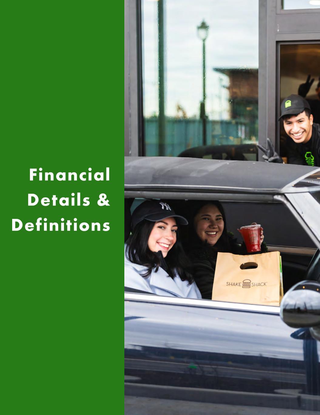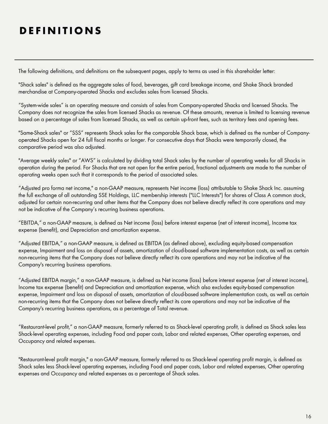 D E F I N I T I O N S 16 The following definitions, and definitions on the subsequent pages, apply to terms as used in this shareholder letter: "Shack sales" is defined as the aggregate sales of food, beverages, gift card breakage income, and Shake Shack branded merchandise at Company-operated Shacks and excludes sales from licensed Shacks. “System-wide sales” is an operating measure and consists of sales from Company-operated Shacks and licensed Shacks. The Company does not recognize the sales from licensed Shacks as revenue. Of these amounts, revenue is limited to licensing revenue based on a percentage of sales from licensed Shacks, as well as certain up-front fees, such as territory fees and opening fees. "Same-Shack sales" or “SSS” represents Shack sales for the comparable Shack base, which is defined as the number of Company- operated Shacks open for 24 full fiscal months or longer. For consecutive days that Shacks were temporarily closed, the comparative period was also adjusted. "Average weekly sales" or “AWS” is calculated by dividing total Shack sales by the number of operating weeks for all Shacks in operation during the period. For Shacks that are not open for the entire period, fractional adjustments are made to the number of operating weeks open such that it corresponds to the period of associated sales. “Adjusted pro forma net income," a non-GAAP measure, represents Net income (loss) attributable to Shake Shack Inc. assuming the full exchange of all outstanding SSE Holdings, LLC membership interests ("LLC Interests") for shares of Class A common stock, adjusted for certain non-recurring and other items that the Company does not believe directly reflect its core operations and may not be indicative of the Company’s recurring business operations. “EBITDA,” a non-GAAP measure, is defined as Net income (loss) before interest expense (net of interest income), Income tax expense (benefit), and Depreciation and amortization expense. “Adjusted EBITDA,” a non-GAAP measure, is defined as EBITDA (as defined above), excluding equity-based compensation expense, Impairment and loss on disposal of assets, amortization of cloud-based software implementation costs, as well as certain non-recurring items that the Company does not believe directly reflect its core operations and may not be indicative of the Company's recurring business operations. “Adjusted EBITDA margin,” a non-GAAP measure, is defined as Net income (loss) before interest expense (net of interest income), Income tax expense (benefit) and Depreciation and amortization expense, which also excludes equity-based compensation expense, Impairment and loss on disposal of assets, amortization of cloud-based software implementation costs, as well as certain non-recurring items that the Company does not believe directly reflect its core operations and may not be indicative of the Company's recurring business operations, as a percentage of Total revenue. “Restaurant-level profit,” a non-GAAP measure, formerly referred to as Shack-level operating profit, is defined as Shack sales less Shack-level operating expenses, including Food and paper costs, Labor and related expenses, Other operating expenses, and Occupancy and related expenses. "Restaurant-level profit margin," a non-GAAP measure, formerly referred to as Shack-level operating profit margin, is defined as Shack sales less Shack-level operating expenses, including Food and paper costs, Labor and related expenses, Other operating expenses and Occupancy and related expenses as a percentage of Shack sales.
