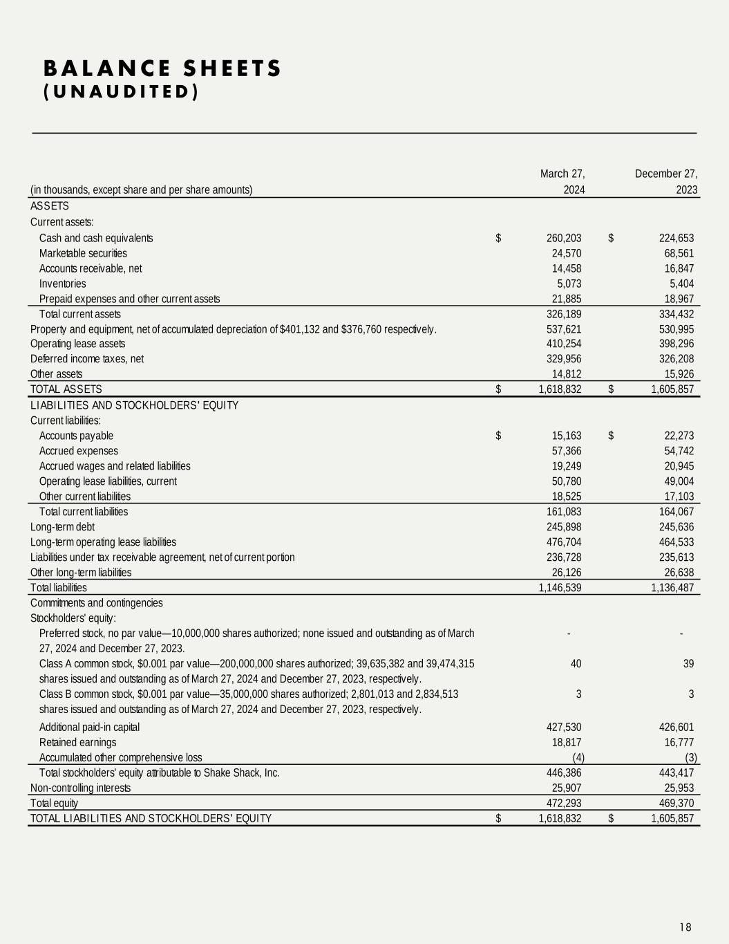 B A L A N C E S H E E T S ( U N A U D I T E D ) 18 March 27, December 27, 2024 2023 ASSETS Current assets: Cash and cash equivalents 260,203$ 224,653$ Marketable securities 24,570 68,561 Accounts receivable, net 14,458 16,847 Inventories 5,073 5,404 Prepaid expenses and other current assets 21,885 18,967 Total current assets 326,189 334,432 Property and equipment, net of accumulated depreciation of $401,132 and $376,760 respectively. 537,621 530,995 Operating lease assets 410,254 398,296 Deferred income taxes, net 329,956 326,208 Other assets 14,812 15,926 TOTAL ASSETS 1,618,832$ 1,605,857$ LIABILITIES AND STOCKHOLDERS' EQUITY Current liabilities: Accounts payable 15,163$ 22,273$ Accrued expenses 57,366 54,742 Accrued wages and related liabilities 19,249 20,945 Operating lease liabilities, current 50,780 49,004 Other current liabilities 18,525 17,103 Total current liabilities 161,083 164,067 Long-term debt 245,898 245,636 Long-term operating lease liabilities 476,704 464,533 Liabilities under tax receivable agreement, net of current portion 236,728 235,613 Other long-term liabilities 26,126 26,638 Total liabilities 1,146,539 1,136,487 Commitments and contingencies Stockholders' equity: Preferred stock, no par value—10,000,000 shares authorized; none issued and outstanding as of March 27, 2024 and December 27, 2023. - - Class A common stock, $0.001 par value—200,000,000 shares authorized; 39,635,382 and 39,474,315 shares issued and outstanding as of March 27, 2024 and December 27, 2023, respectively. 40 39 Class B common stock, $0.001 par value—35,000,000 shares authorized; 2,801,013 and 2,834,513 shares issued and outstanding as of March 27, 2024 and December 27, 2023, respectively. 3 3 Additional paid-in capital 427,530 426,601 Retained earnings 18,817 16,777 Accumulated other comprehensive loss (4) (3) Total stockholders' equity attributable to Shake Shack, Inc. 446,386 443,417 Non-controlling interests 25,907 25,953 Total equity 472,293 469,370 TOTAL LIABILITIES AND STOCKHOLDERS' EQUITY 1,618,832$ 1,605,857$ (in thousands, except share and per share amounts)