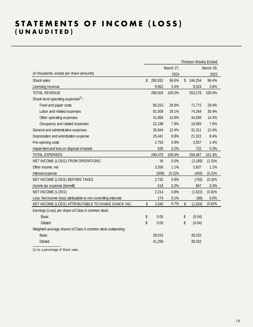 Shack sales 280,552$ 96.6% 244,254$ 96.4% Licensing revenue 9,952 3.4% 9,024 3.6% TOTAL REVENUE 290,504 100.0% 253,278 100.0% Shack-level operating expenses(1): Food and paper costs 80,253 28.6% 71,772 29.4% Labor and related expenses 81,509 29.1% 74,264 30.4% Other operating expenses 41,856 14.9% 34,936 14.3% Occupancy and related expenses 22,188 7.9% 18,583 7.6% General and administrative expenses 35,944 12.4% 31,311 12.4% Depreciation and amortization expense 25,441 8.8% 21,322 8.4% Pre-opening costs 2,753 0.9% 3,557 1.4% Impairment and loss on disposal of assets 526 0.2% 722 0.3% TOTAL EXPENSES 290,470 100.0% 256,467 101.3% NET INCOME (LOSS) FROM OPERATIONS 34 0.0% (3,189) (1.3)% Other income, net 3,206 1.1% 2,837 1.1% Interest expense (508) (0.2)% (403) (0.2)% NET INCOME (LOSS) BEFORE TAXES 2,732 0.9% (755) (0.3)% Income tax expense (benefit) 518 0.2% 867 0.3% NET INCOME (LOSS) 2,214 0.8% (1,622) (0.6)% Less: Net income (loss) attributable to non-controlling interests 174 0.1% (88) 0.0% NET INCOME (LOSS) ATTRIBUTABLE TO SHAKE SHACK INC. 2,040$ 0.7% (1,534)$ (0.6)% Earnings (Loss) per share of Class A common stock: Basic $ 0.05 $ (0.04) Diluted $ 0.05 $ (0.04) Weighted-average shares of Class A common stock outstanding: Basic 39,515 39,332 Diluted 41,259 39,332 _______________ March 29, Thirteen Weeks Ended (in thousands, except per share amounts) 2024 2023 (1) As a percentage of Shack sales. March 27, S T A T E M E N T S O F I N C O M E ( L O S S ) ( U N A U D I T E D ) 19