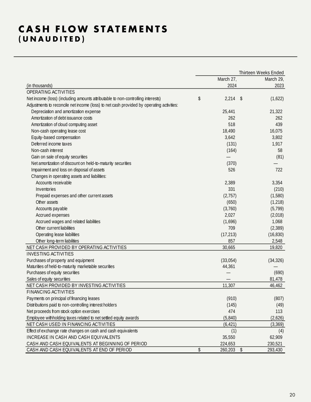 C A S H F L O W S TAT E M E N T S ( U N A U D I T E D ) 20 March 27, March 29, (in thousands) 2024 2023 OPERATING ACTIVITIES Net income (loss) (including amounts attributable to non-controlling interests) 2,214$ (1,622)$ Adjustments to reconcile net income (loss) to net cash provided by operating activities: Depreciation and amortization expense 25,441 21,322 Amortization of debt issuance costs 262 262 Amortization of cloud computing asset 518 439 Non-cash operating lease cost 18,490 16,075 Equity-based compensation 3,642 3,802 Deferred income taxes (131) 1,917 Non-cash interest (164) 58 Gain on sale of equity securities — (81) Net amortization of discount on held-to-maturity securities (370) — Impairment and loss on disposal of assets 526 722 Changes in operating assets and liabilities: Accounts receivable 2,389 3,354 Inventories 331 (210) Prepaid expenses and other current assets (2,757) (1,580) Other assets (650) (1,218) Accounts payable (3,760) (5,799) Accrued expenses 2,027 (2,018) Accrued wages and related liabilities (1,696) 1,068 Other current liabilities 709 (2,389) Operating lease liabilities (17,213) (16,830) Other long-term liabilities 857 2,548 NET CASH PROVIDED BY OPERATING ACTIVITIES 30,665 19,820 INVESTING ACTIVITIES Purchases of property and equipment (33,054) (34,326) Maturities of held-to-maturity marketable securities 44,361 — Purchases of equity securities — (690) Sales of equity securities — 81,478 NET CASH PROVIDED BY INVESTING ACTIVITIES 11,307 46,462 FINANCING ACTIVITIES Payments on principal of financing leases (910) (807) Distributions paid to non-controlling interest holders (145) (49) Net proceeds from stock option exercises 474 113 Employee withholding taxes related to net settled equity awards (5,840) (2,626) NET CASH USED IN FINANCING ACTIVITIES (6,421) (3,369) Effect of exchange rate changes on cash and cash equivalents (1) (4) INCREASE IN CASH AND CASH EQUIVALENTS 35,550 62,909 CASH AND CASH EQUIVALENTS AT BEGINNING OF PERIOD 224,653 230,521 CASH AND CASH EQUIVALENTS AT END OF PERIOD 260,203$ 293,430$ Thirteen Weeks Ended