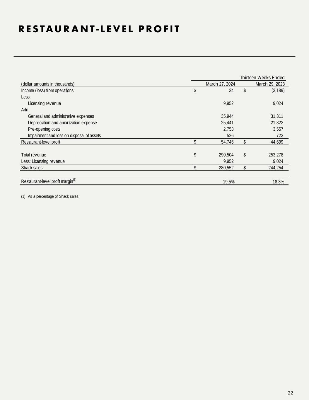 R E S TA U R A N T - L E V E L P R O F I T D E F I N I T I O N S 21 Restaurant-Level Profit “Restaurant-level profit,” a non-GAAP measure, formerly referred to as Shack-level operating profit, is defined as Shack sales less Shack-level operating expenses, including Food and paper costs, Labor and related expenses, Other operating expenses, and Occupancy and related expenses. Restaurant-level Profit Margin "Restaurant-level profit margin," a non-GAAP measure, formerly referred to as Shack-level operating profit margin, is defined as Shack sales less Shack-level operating expenses, including Food and paper costs, Labor and related expenses, Other operating expenses and Occupancy and related expenses as a percentage of Shack sales. How This Measure Is Useful When used in conjunction with GAAP financial measures, Restaurant-level profit and Restaurant-level profit margin are supplemental measures of operating performance that the Company believes are useful measures to evaluate the performance and profitability of its Shacks. Additionally, Restaurant-level profit and Restaurant-level profit margin are key metrics used internally by management to develop internal budgets and forecasts, as well as assess the performance of its Shacks relative to budget and against prior periods. It is also used to evaluate employee compensation as it serves as a metric in certain performance-based employee bonus arrangements. The Company believes presentation of Restaurant-level profit and Restaurant-level profit margin provides investors with a supplemental view of its operating performance that can provide meaningful insights to the underlying operating performance of the Shacks, as these measures depict the operating results that are directly impacted by the Shacks and exclude items that may not be indicative of, or are unrelated to, the ongoing operations of the Shacks. It may also assist investors to evaluate the Company's performance relative to peers of various sizes and maturities and provides greater transparency with respect to how management evaluates the business, as well as the financial and operational decision-making. Limitations of the Usefulness of this Measure Restaurant-level profit and Restaurant-level profit margin may differ from similarly titled measures used by other companies due to different methods of calculation. Presentation of Restaurant-level profit and Restaurant-level profit margin is not intended to be considered in isolation or as a substitute for, or superior to, the financial information prepared and presented in accordance with GAAP. Restaurant-level profit excludes certain costs, such as General and administrative expenses and Pre-opening costs, which are considered normal, recurring cash operating expenses and are essential to support the operation and development of the Company's Shacks. Therefore, this measure may not provide a complete understanding of the Company's operating results as a whole and Restaurant-level profit and Restaurant-level profit margin should be reviewed in conjunction with the Company’s GAAP financial results. A reconciliation of Restaurant-level profit to operating income (loss), the most directly comparable GAAP financial measure, is set forth on next slide.